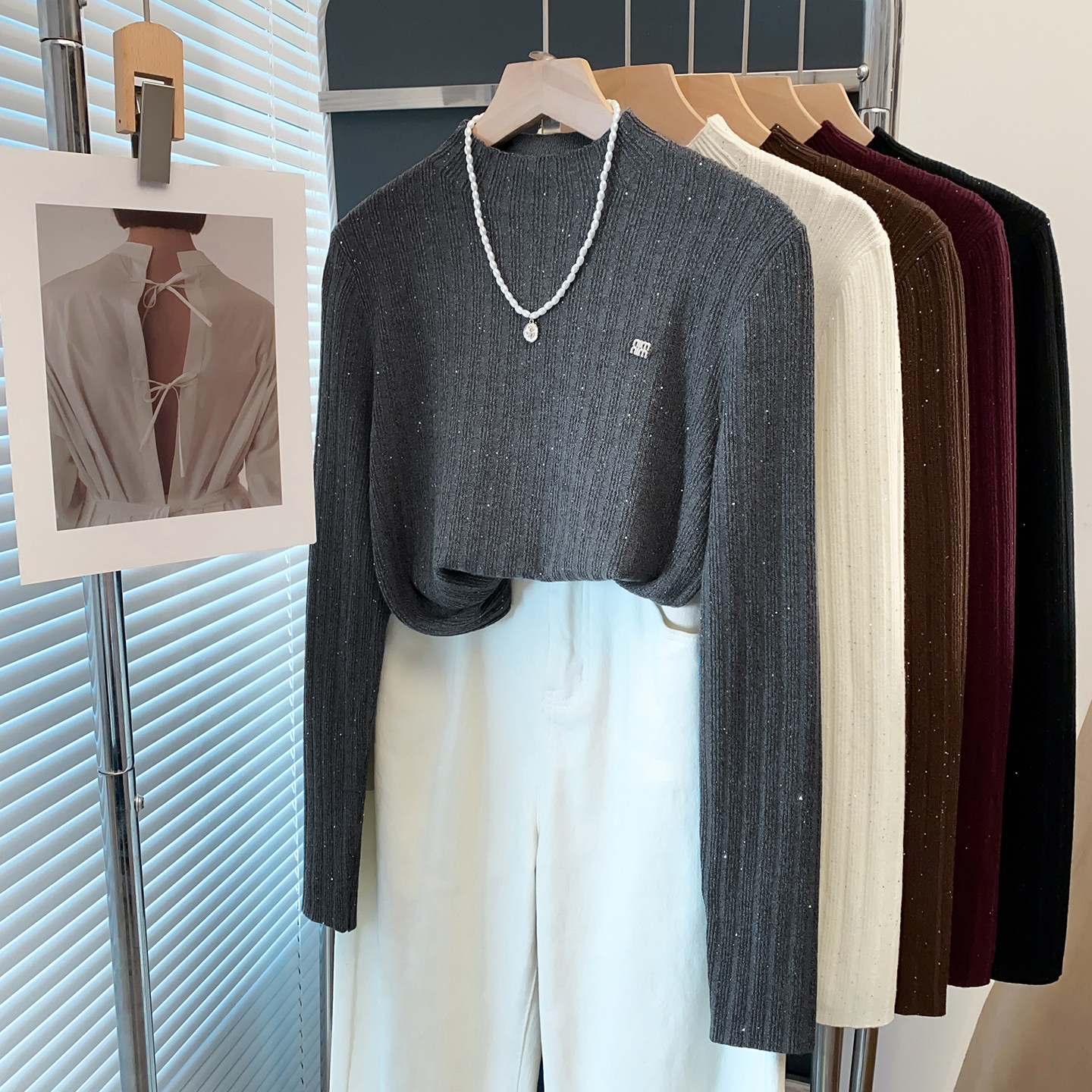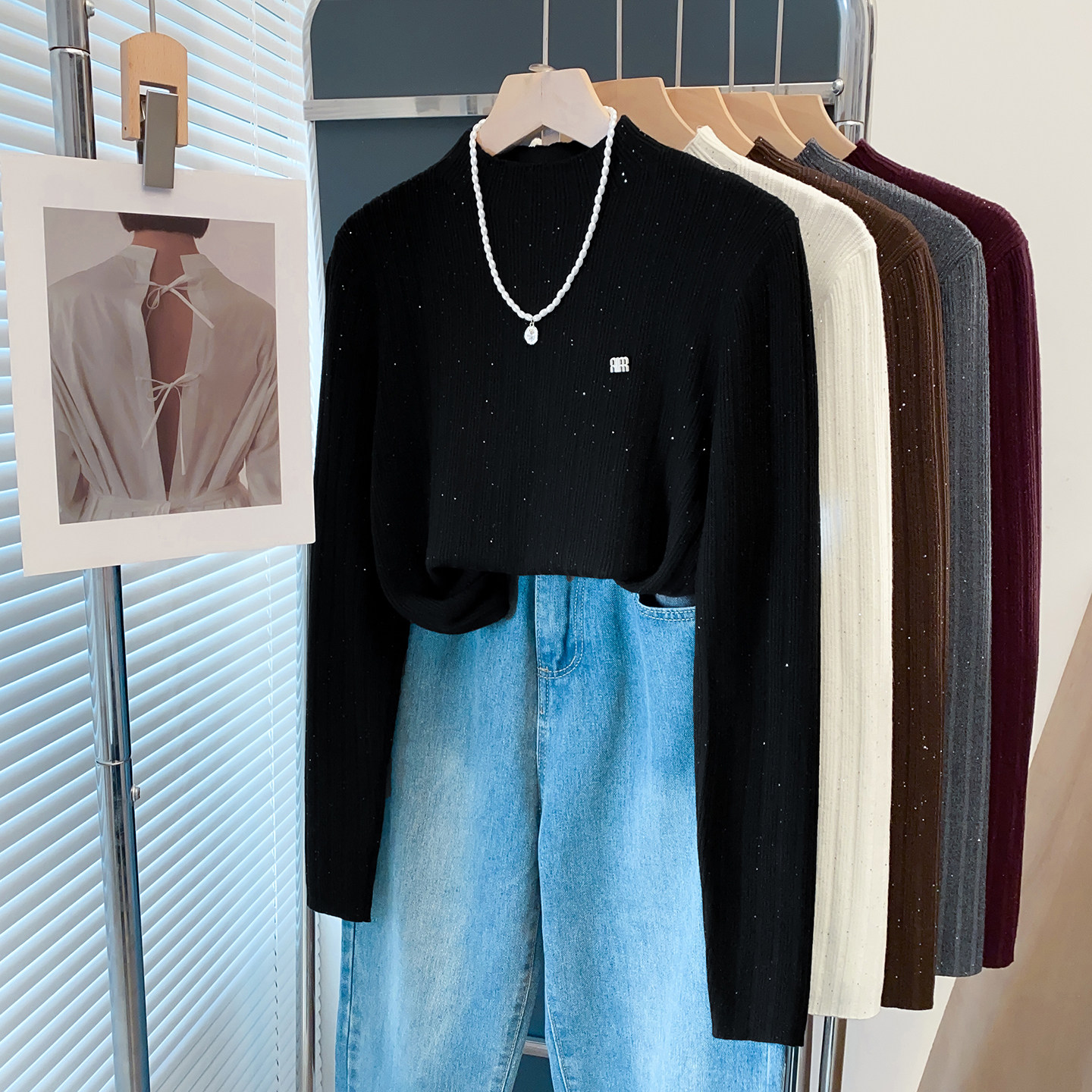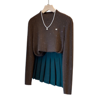 内搭洋气上衣 外穿针织衫 亮片半高领毛衣女坑条打底衫 2025秋冬新款