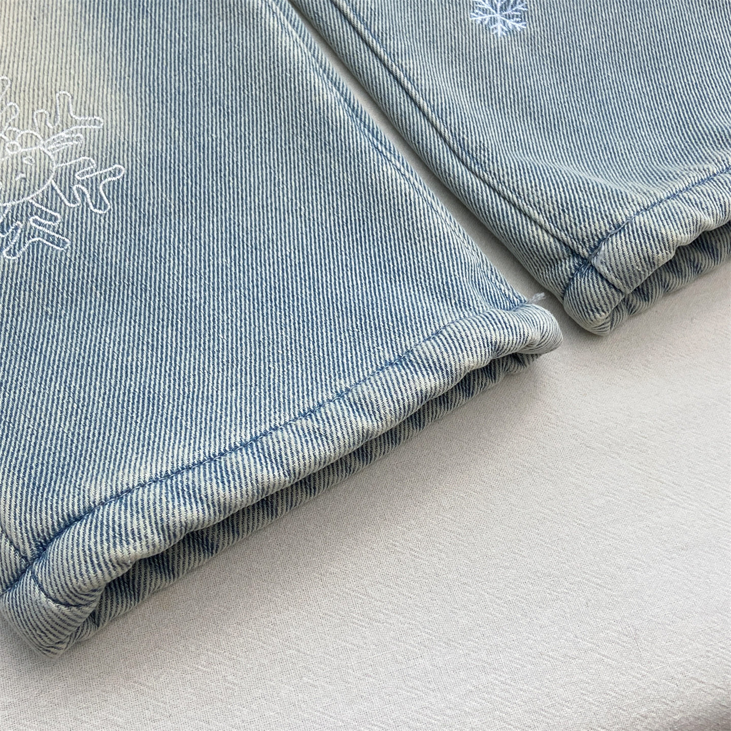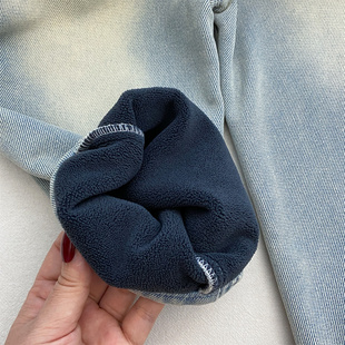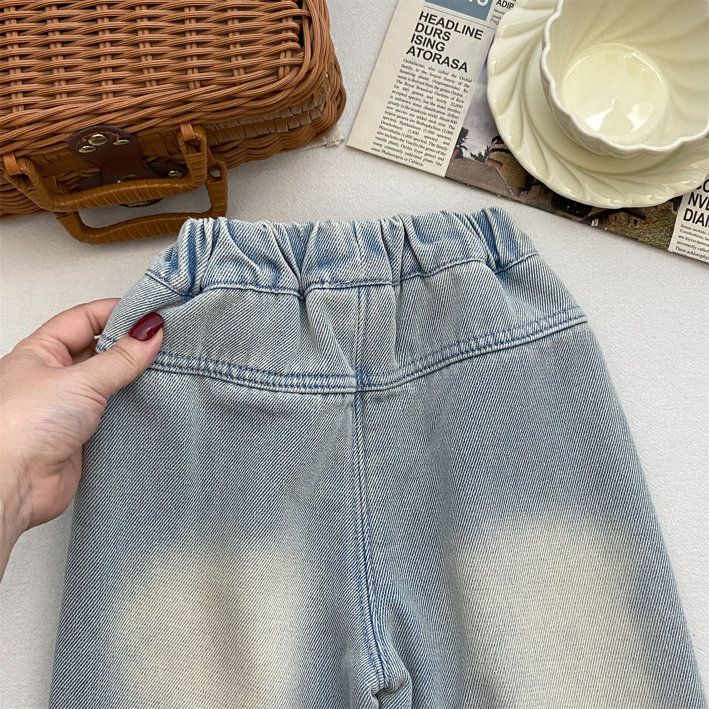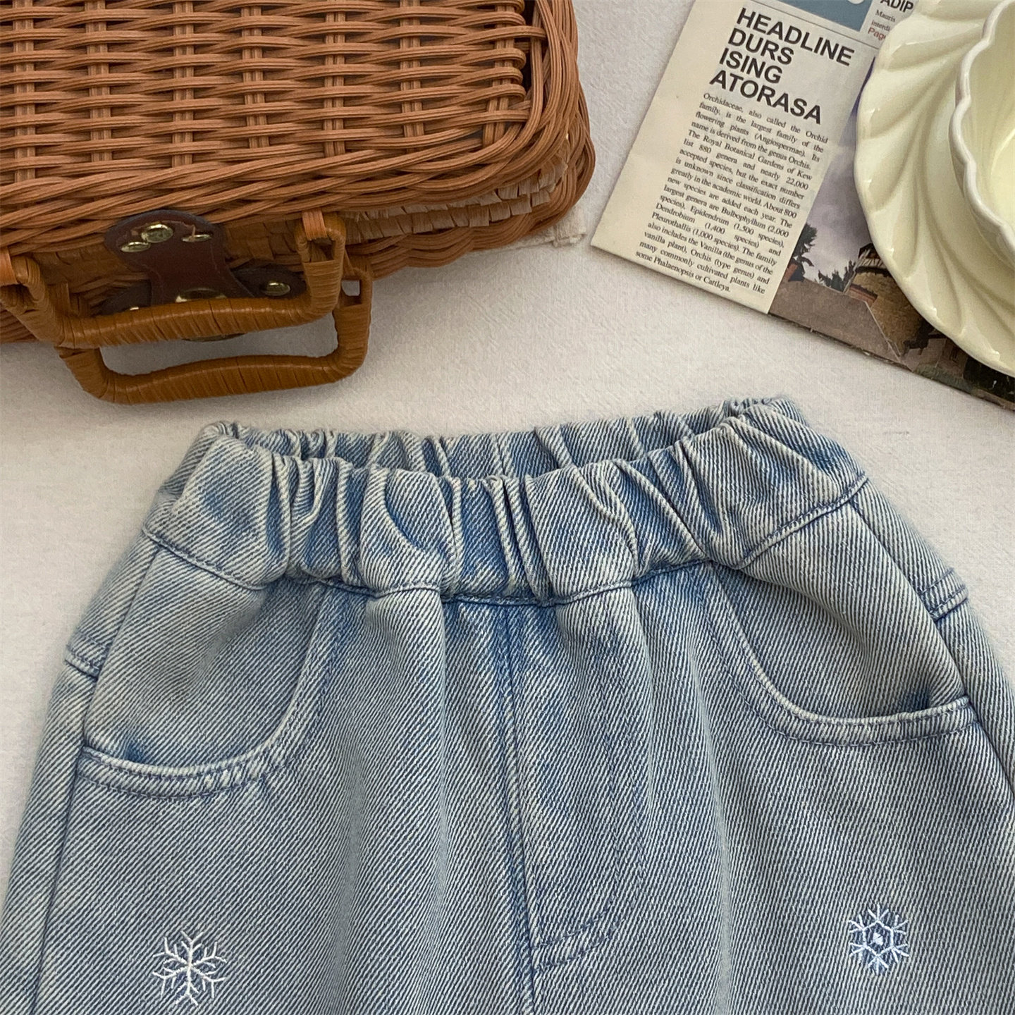 子2025新款 牛仔裤 韩版 时尚 潮 洋气加厚浅蓝色刺绣直筒裤 女童加绒裤