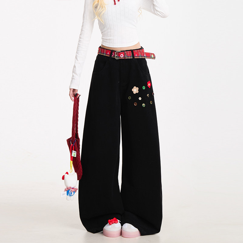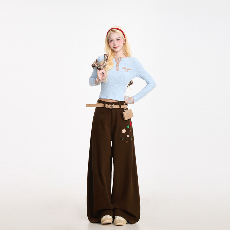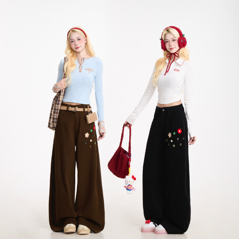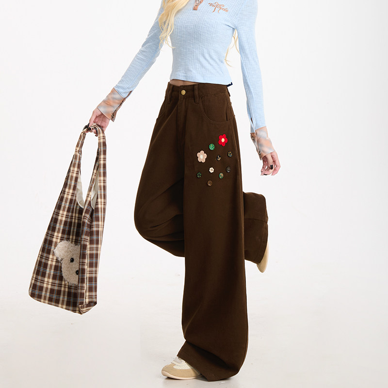 百搭休闲阔腿裤 NERESUM花朵纽扣工装 潮牌垂感直筒裤 女秋冬美式 裤