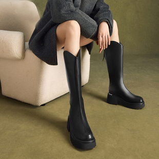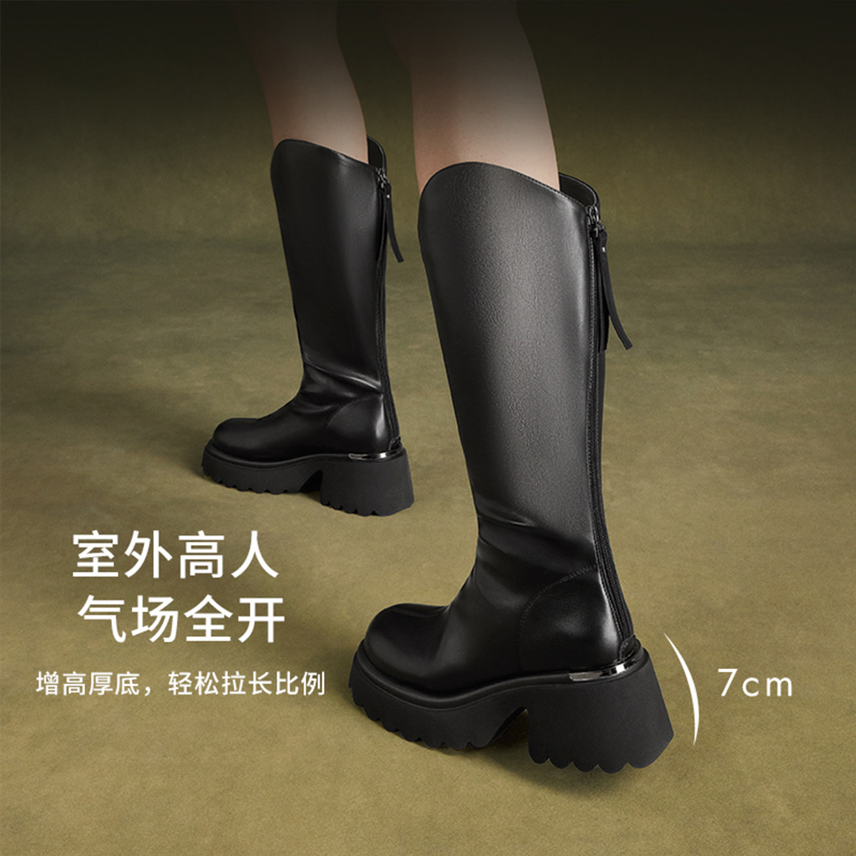 靴皮靴 时装 吴宣仪天美意千金靴复古厚底骑士靴加绒长靴女鞋 子新款