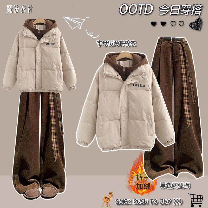 洋气阔腿裤 假两件加厚棉服时尚 两件套 美拉德套装 2025冬季