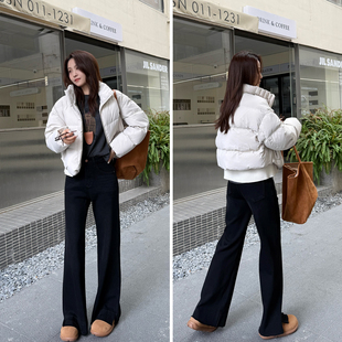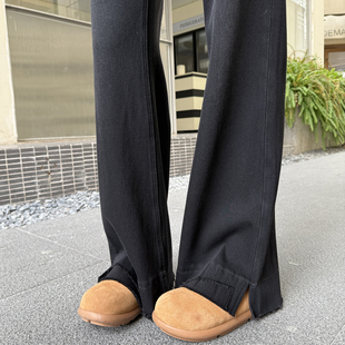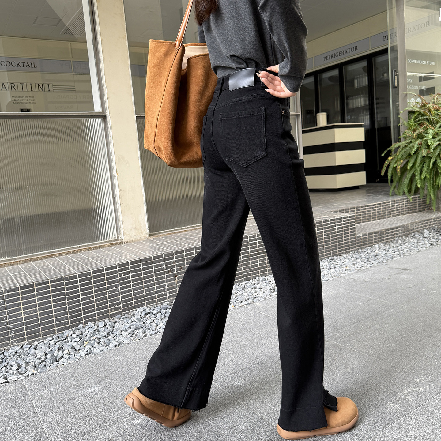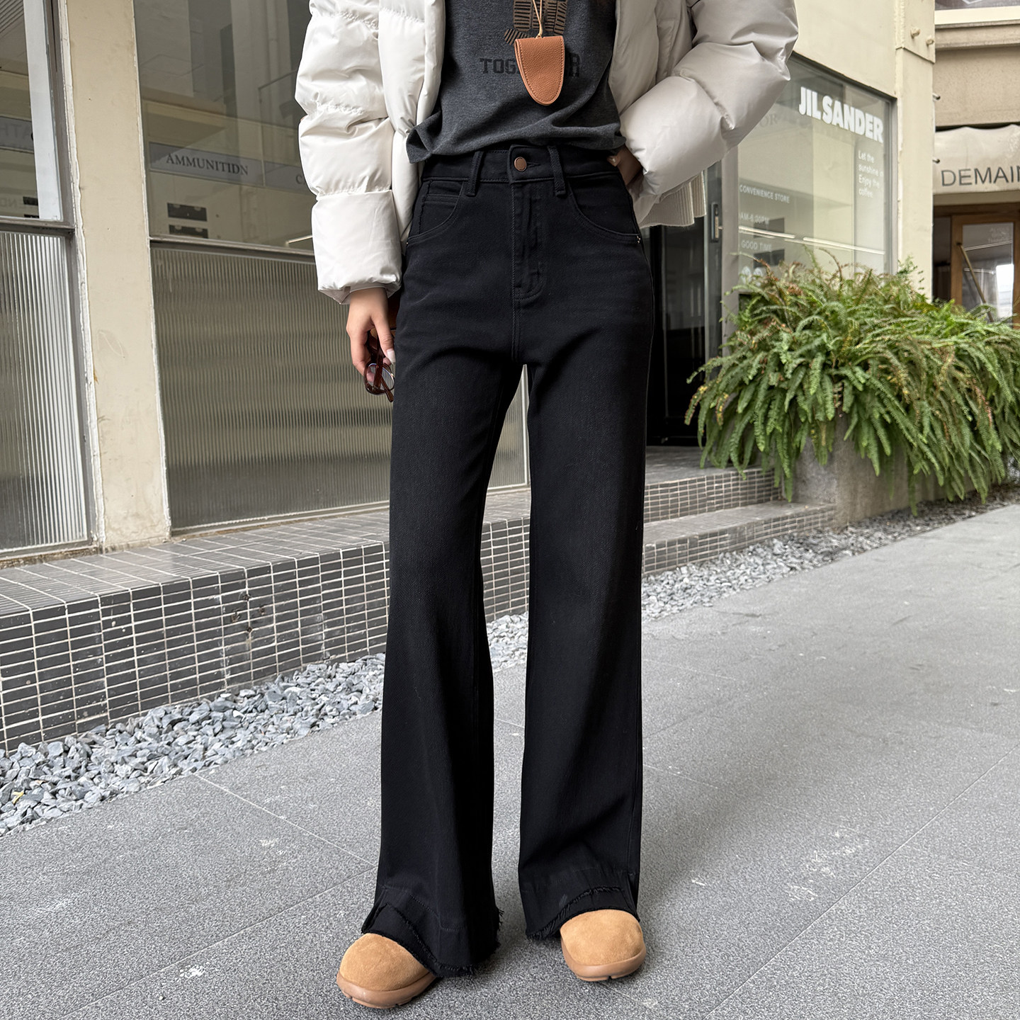 直筒宽松阔腿裤 行走 女秋冬新款 开叉黑色微喇加绒牛仔裤 筷子腿