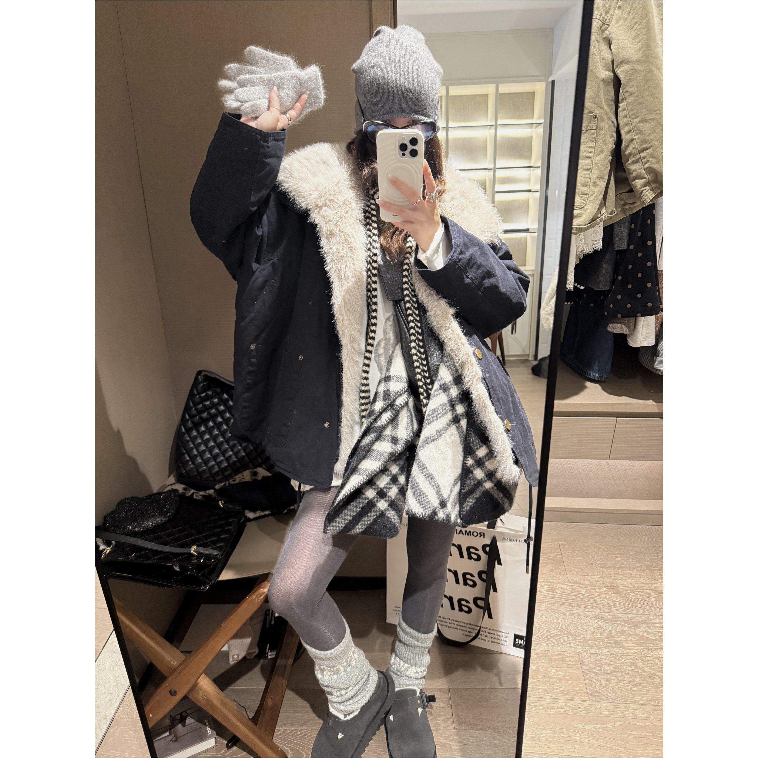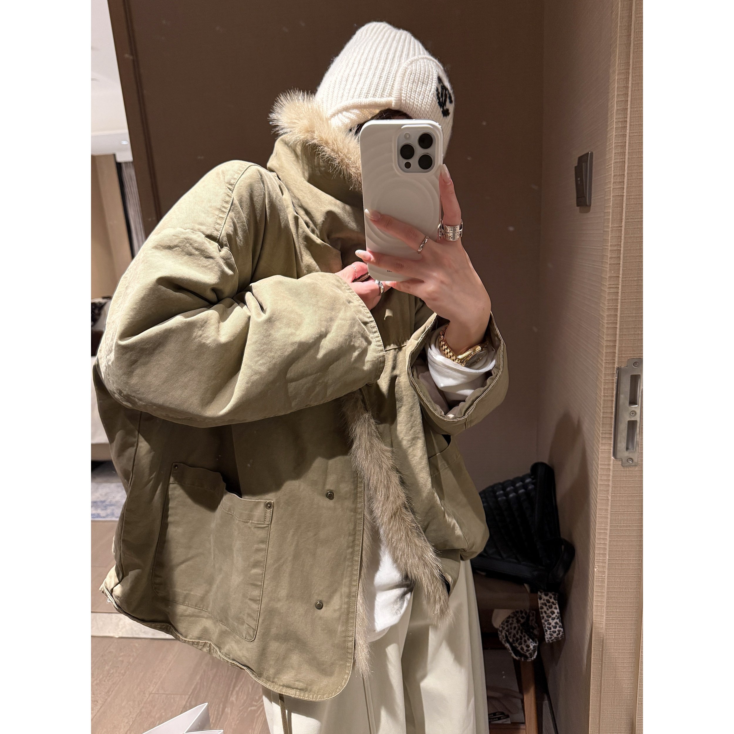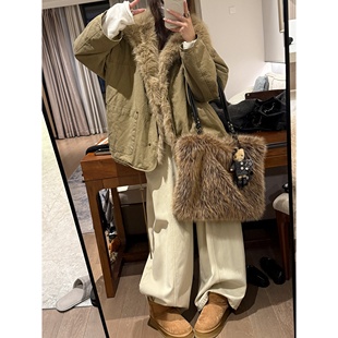 冲锋衣棉服皮草外套 工装 赵露思同款 军绿色毛领羊羔绒派克服女冬季