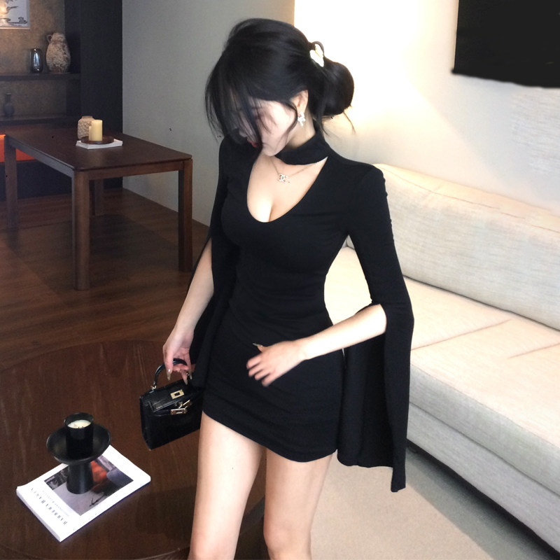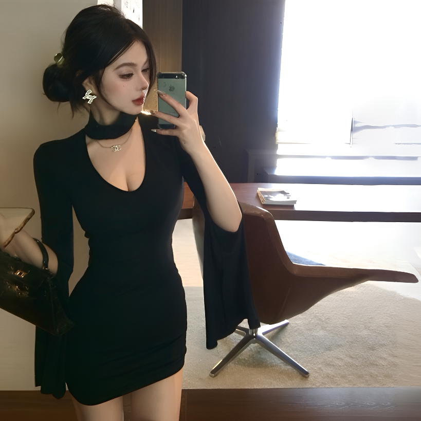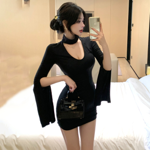 纯欲风性感V领挂脖连衣裙女秋修身 辣妹小众包臀短裙 显瘦气质飘袖
