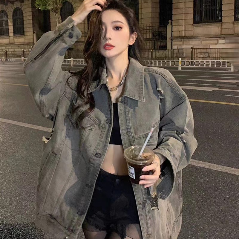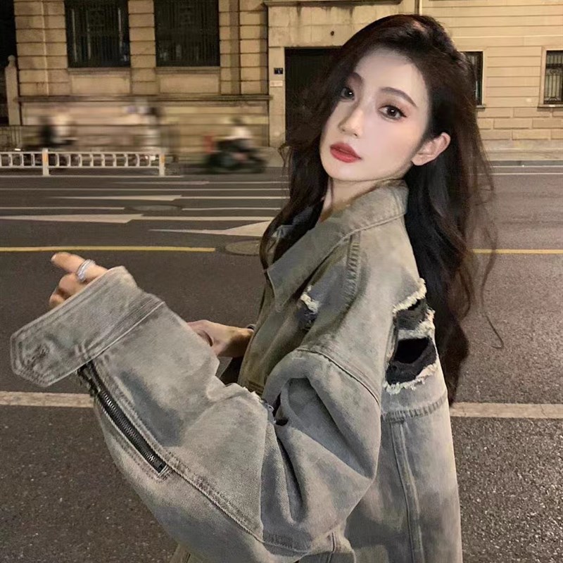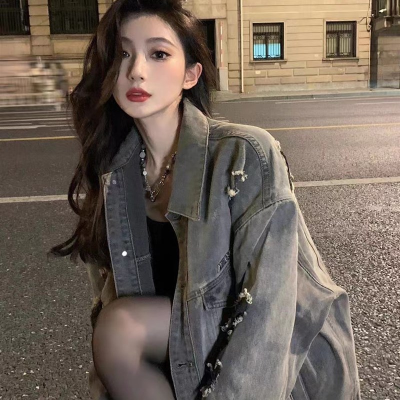宽松百搭水洗破洞开衫 复古牛仔夹克外套女春秋新款 上衣潮 美式 大码
