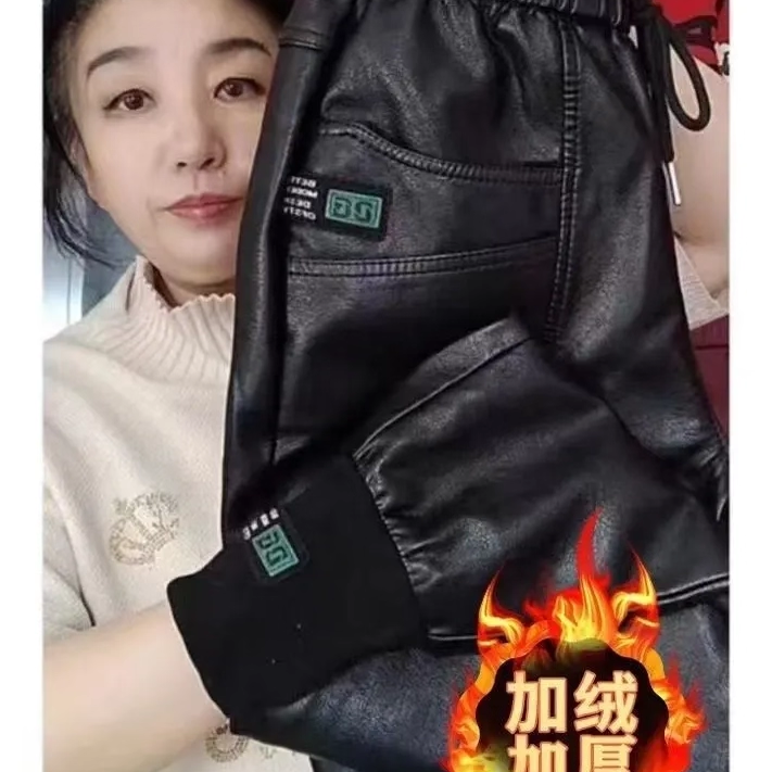 水洗皮马丁裤 加绒皮裤 松紧腰高腰皮裤 加绒加厚2025秋冬新款 老爹裤