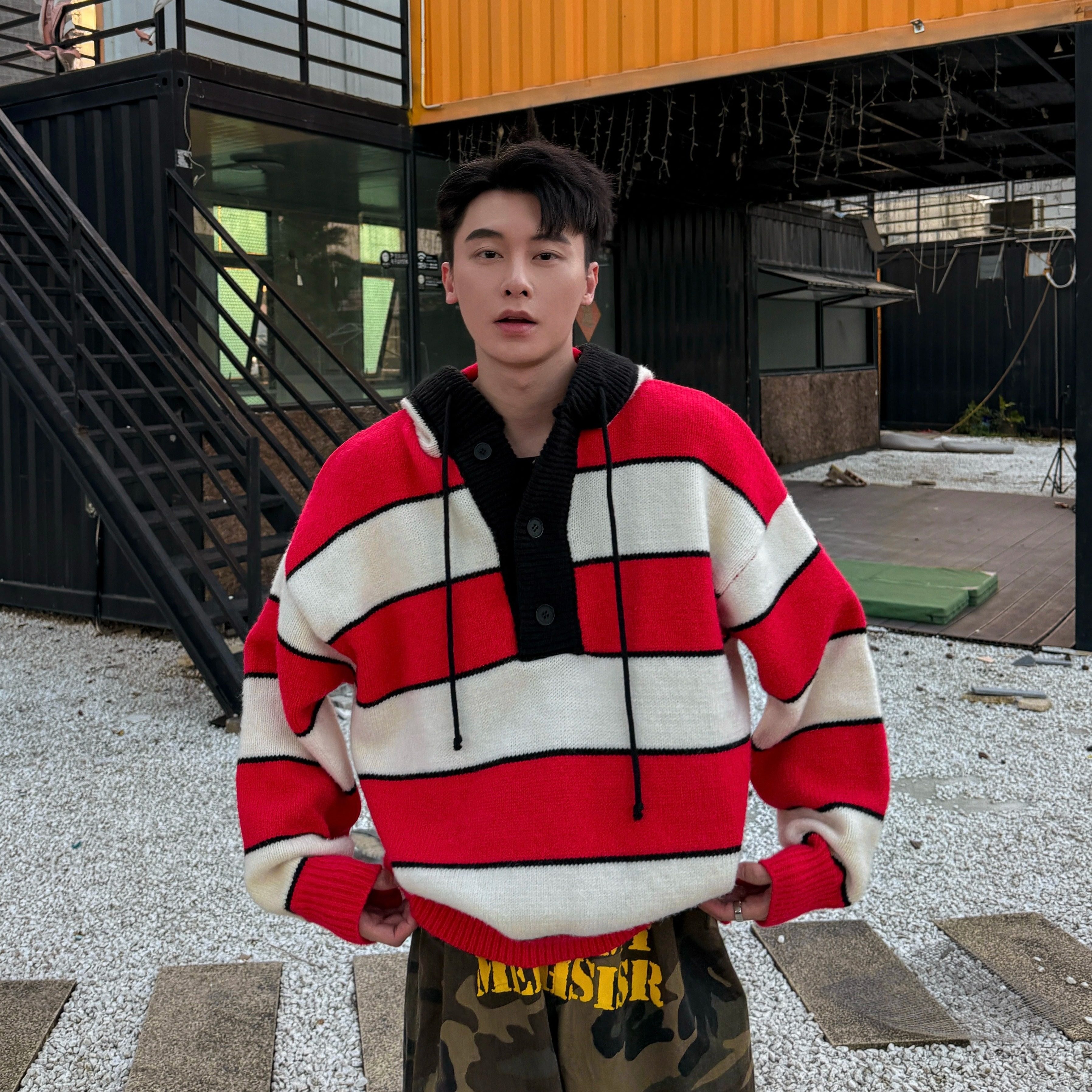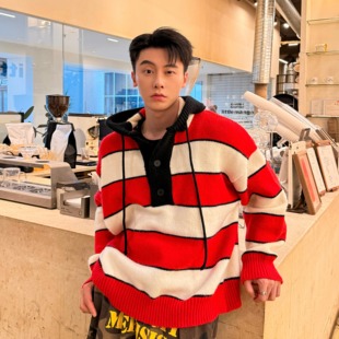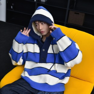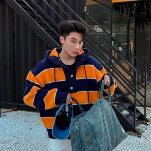 获衣局秋冬宽条纹美式 宽松韩系北极绒提花情侣撞色连帽毛衣1200克