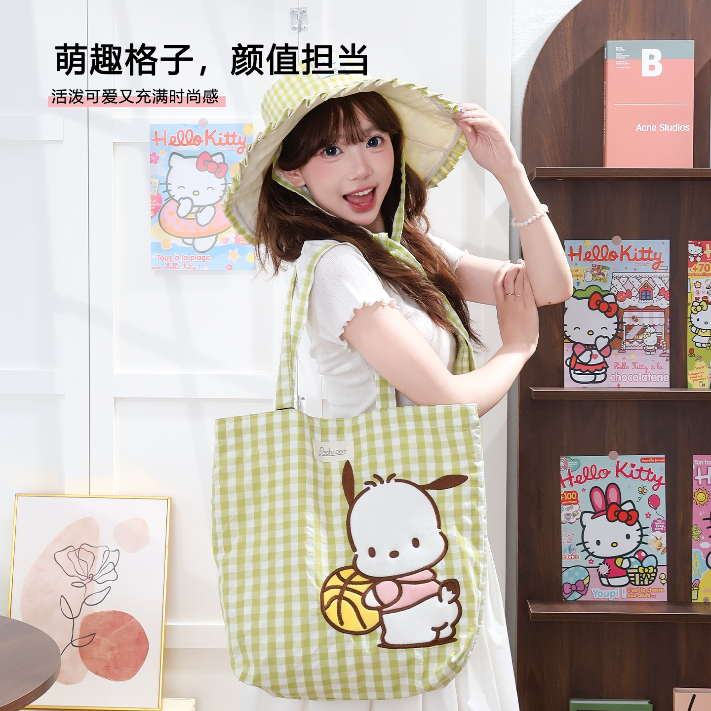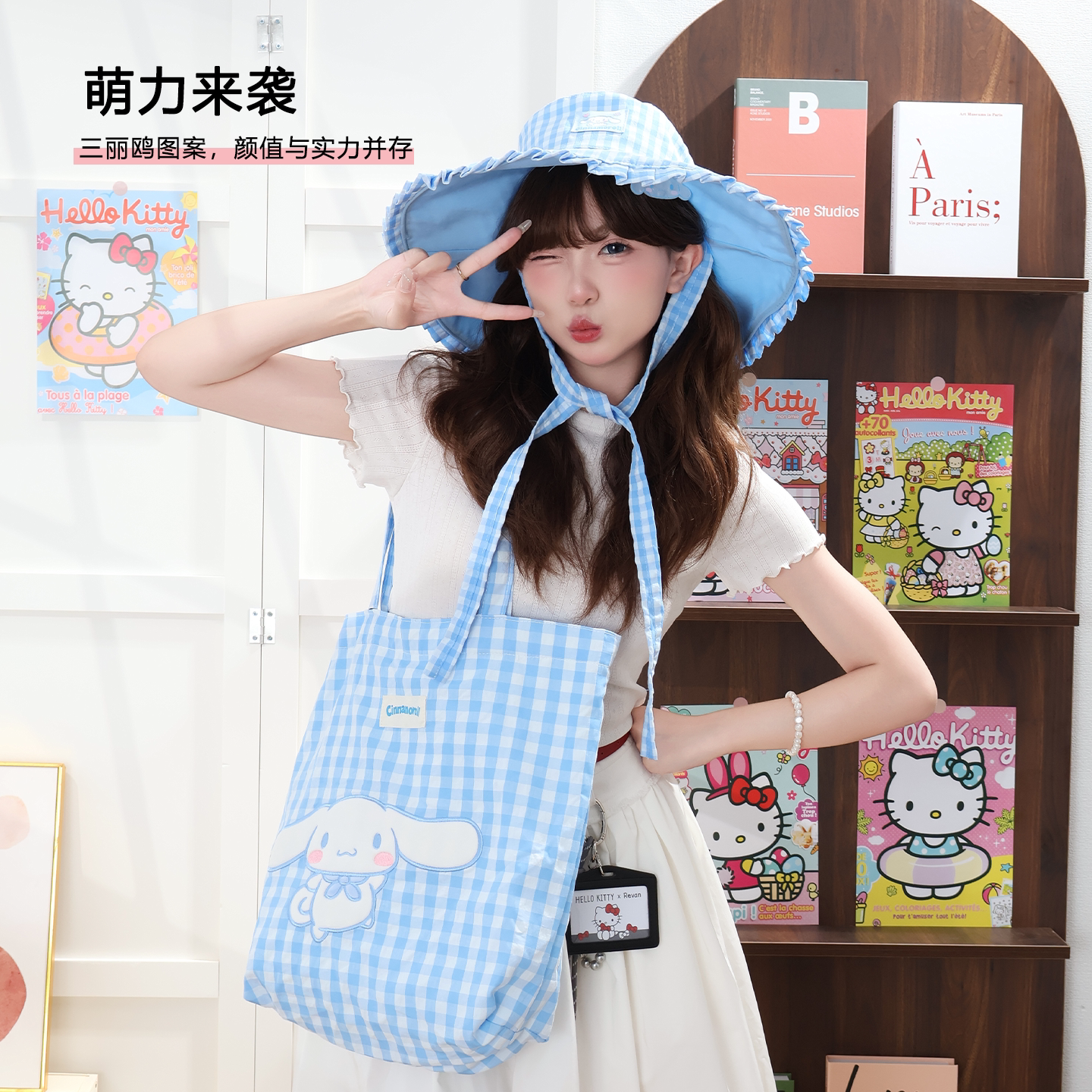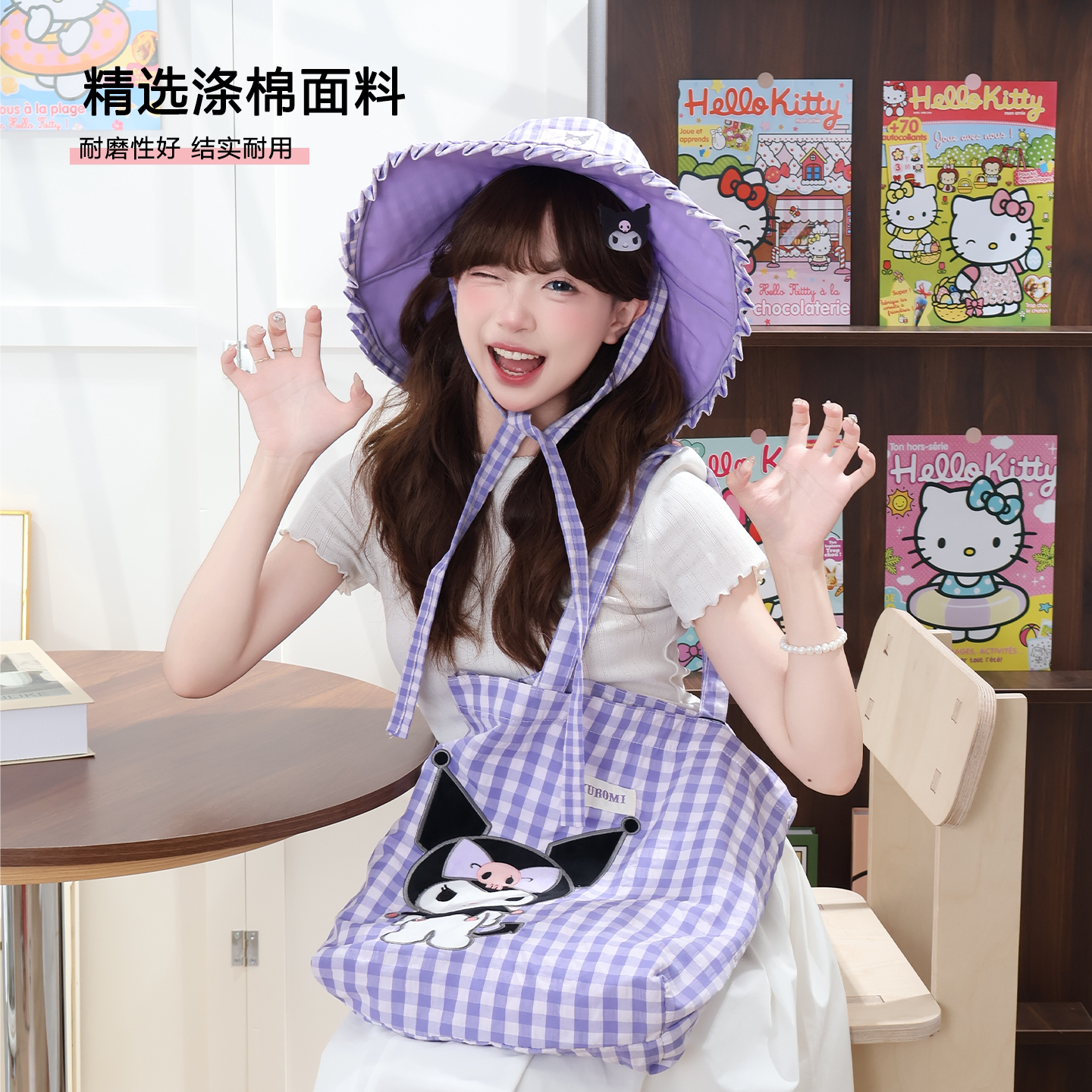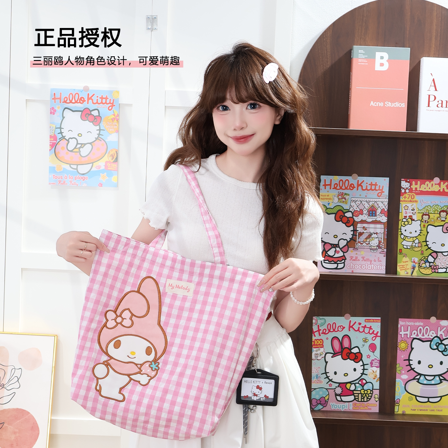 三丽鸥正版 授权凯蒂猫美乐蒂单肩包购物袋可爱少女心大容量格子萌