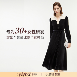 岚天鹅女装 天鹅绒黑白撞色娃娃领轻奢高定宴会25秋冬丝绒连衣裙