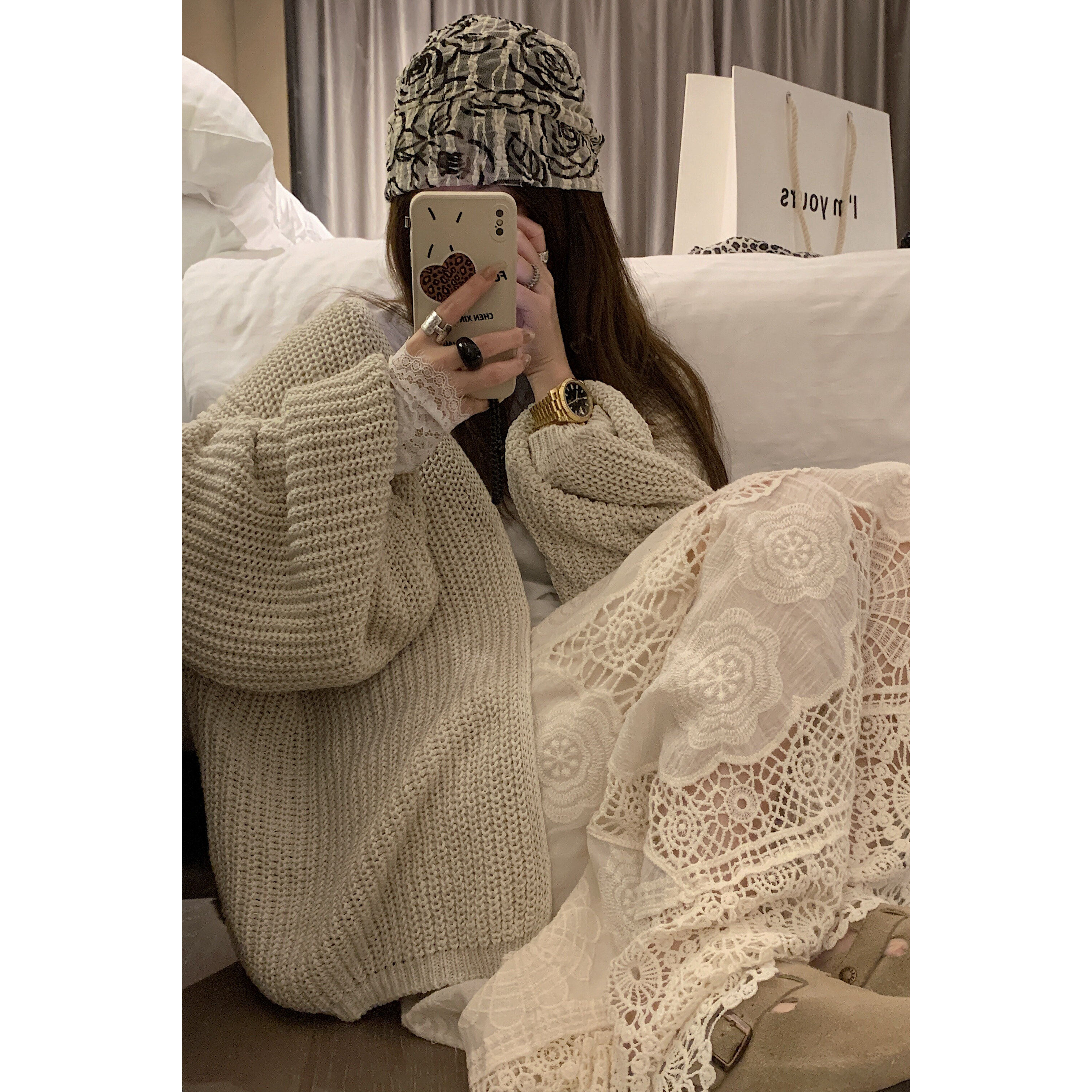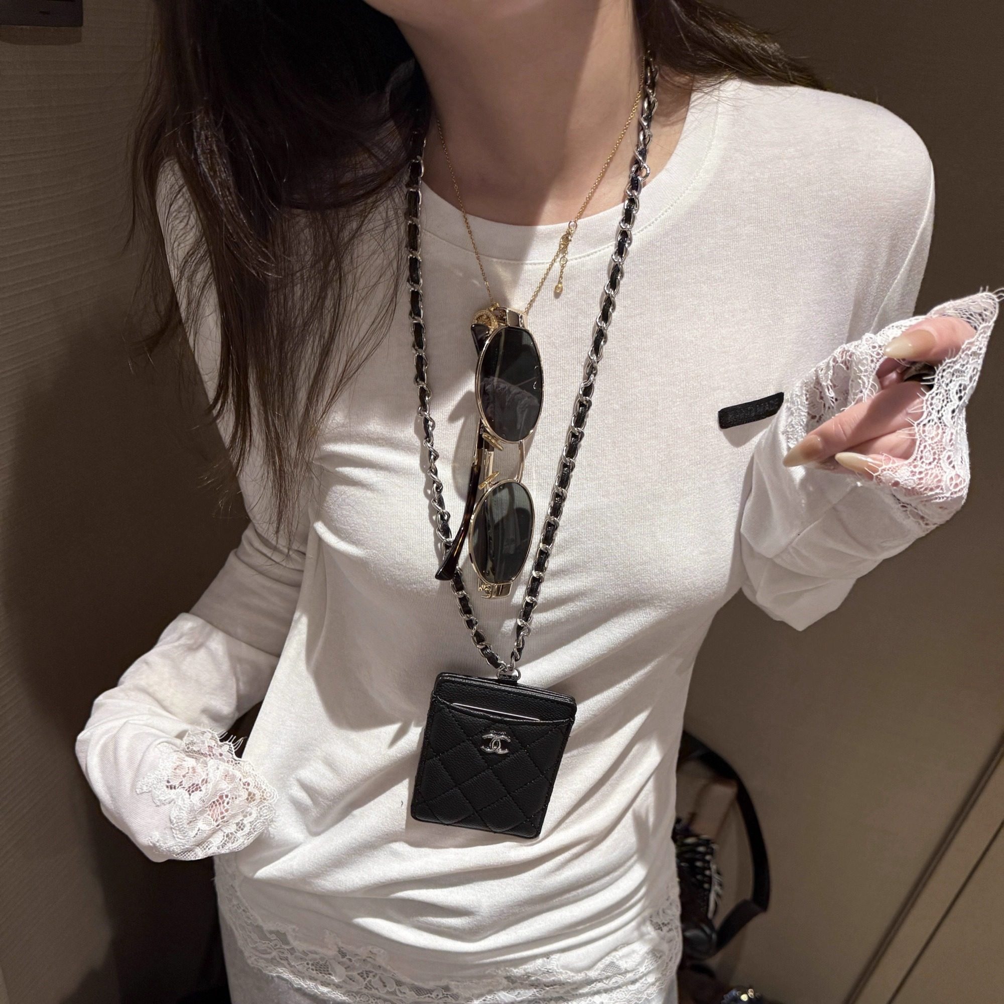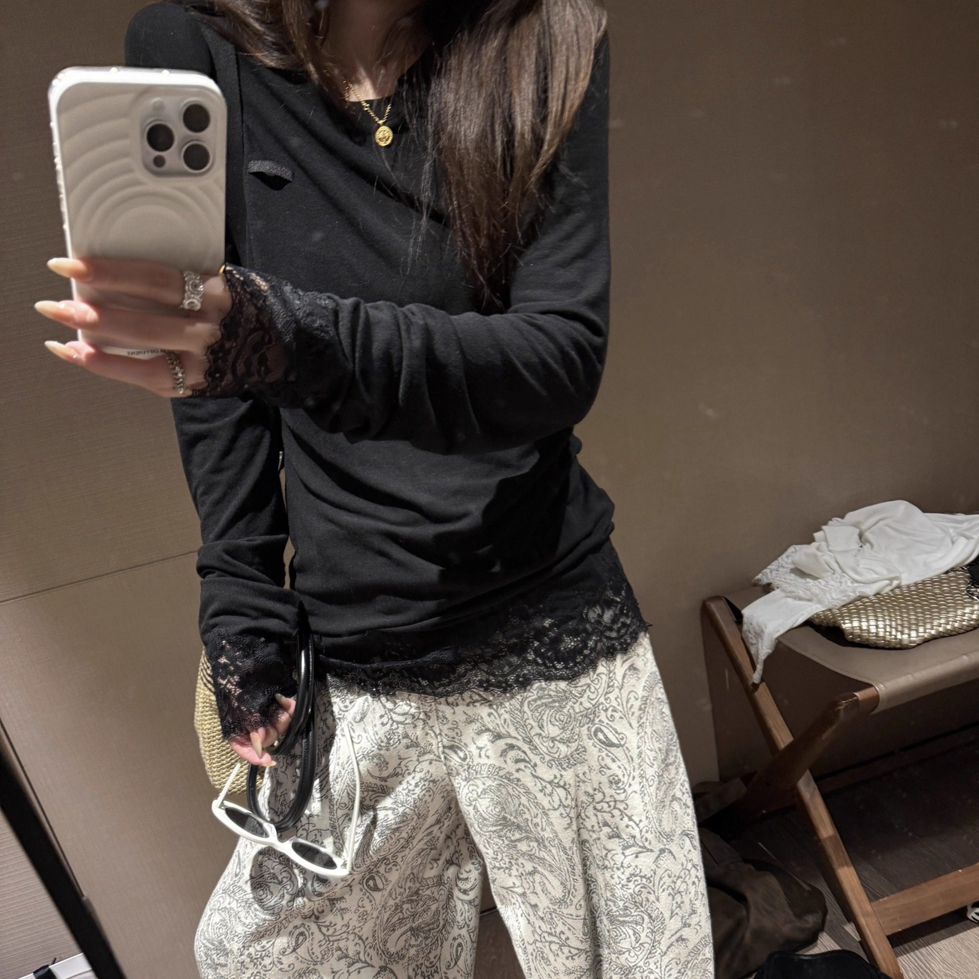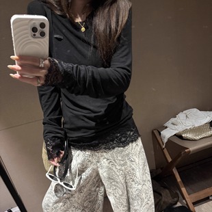打底套头小衫 miu系叠穿拼接正肩内搭长袖 女 黑标蕾丝t FILLE