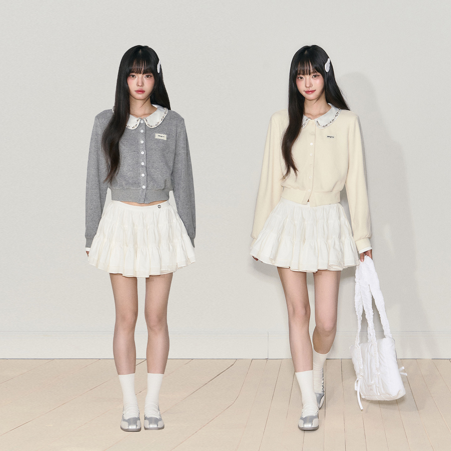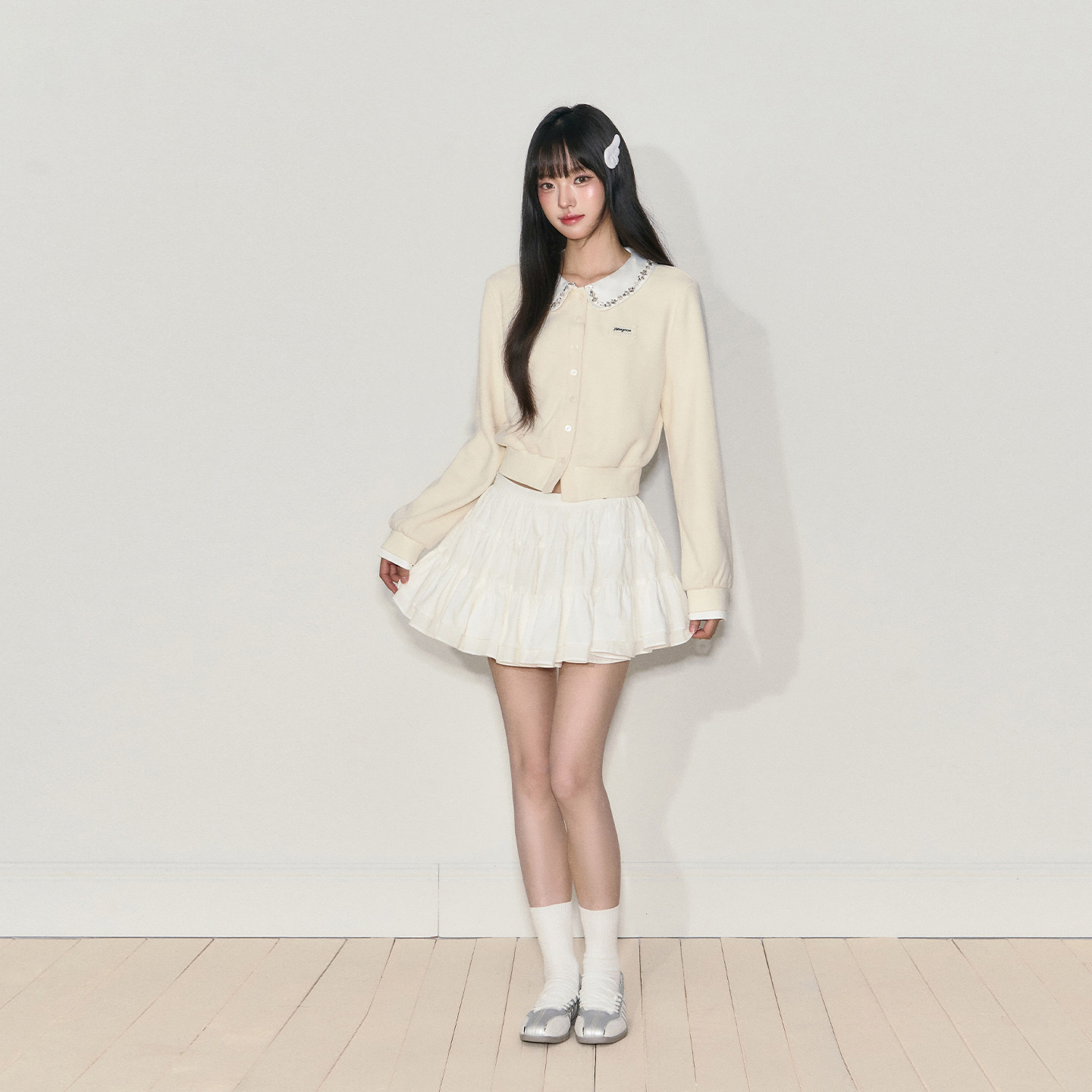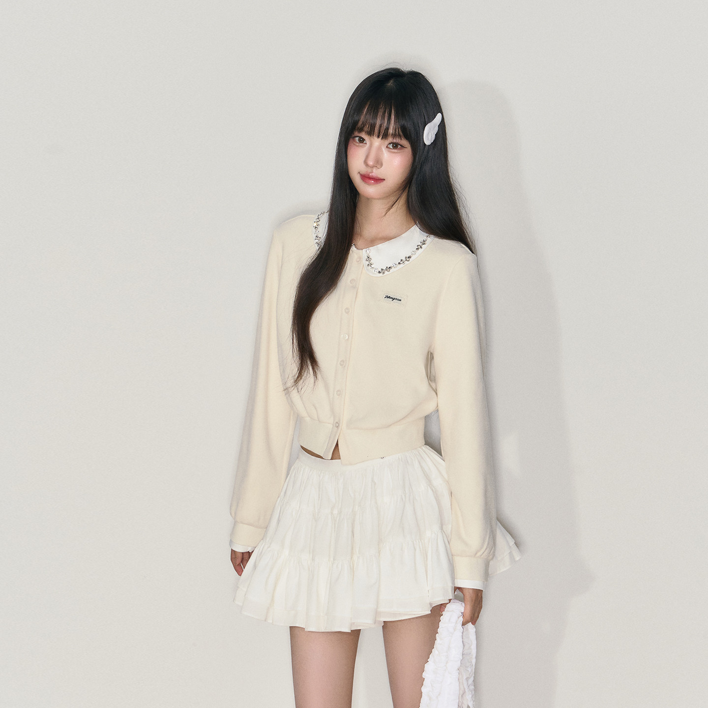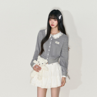 NANGOON 上衣加绒外套女 清冷气质娃娃领水钻针织拼接收腰打短款
