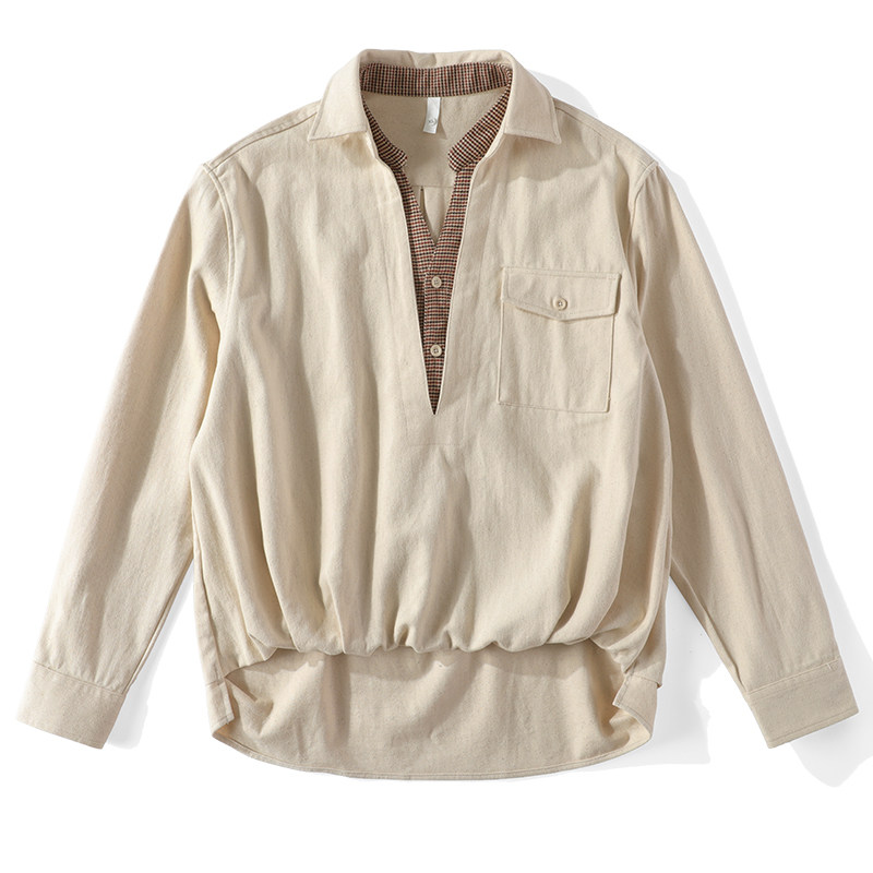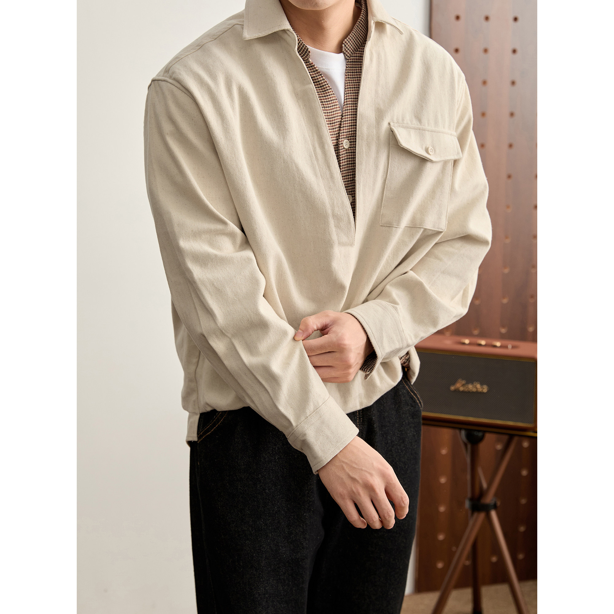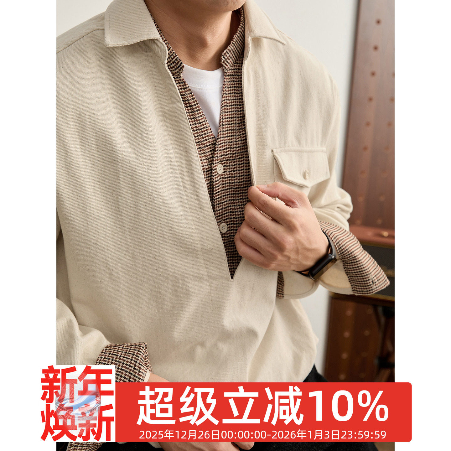 男款 特价 100%纯棉假两件磨毛衬衣复古潮牌千鸟格拼接半开襟衬衫