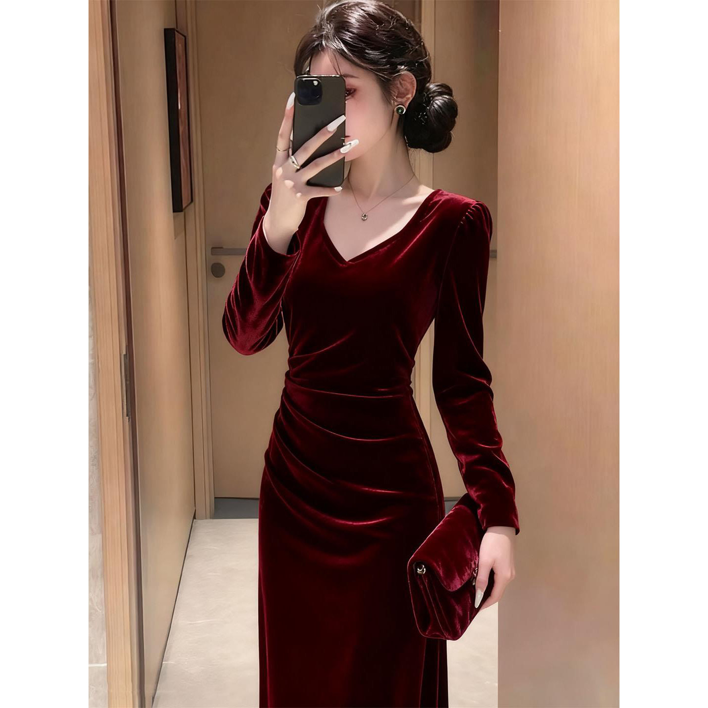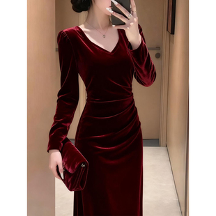 气质修身 酒红色丝绒连衣裙女秋冬高级感长袖 显瘦包臀长裙 女装 大码