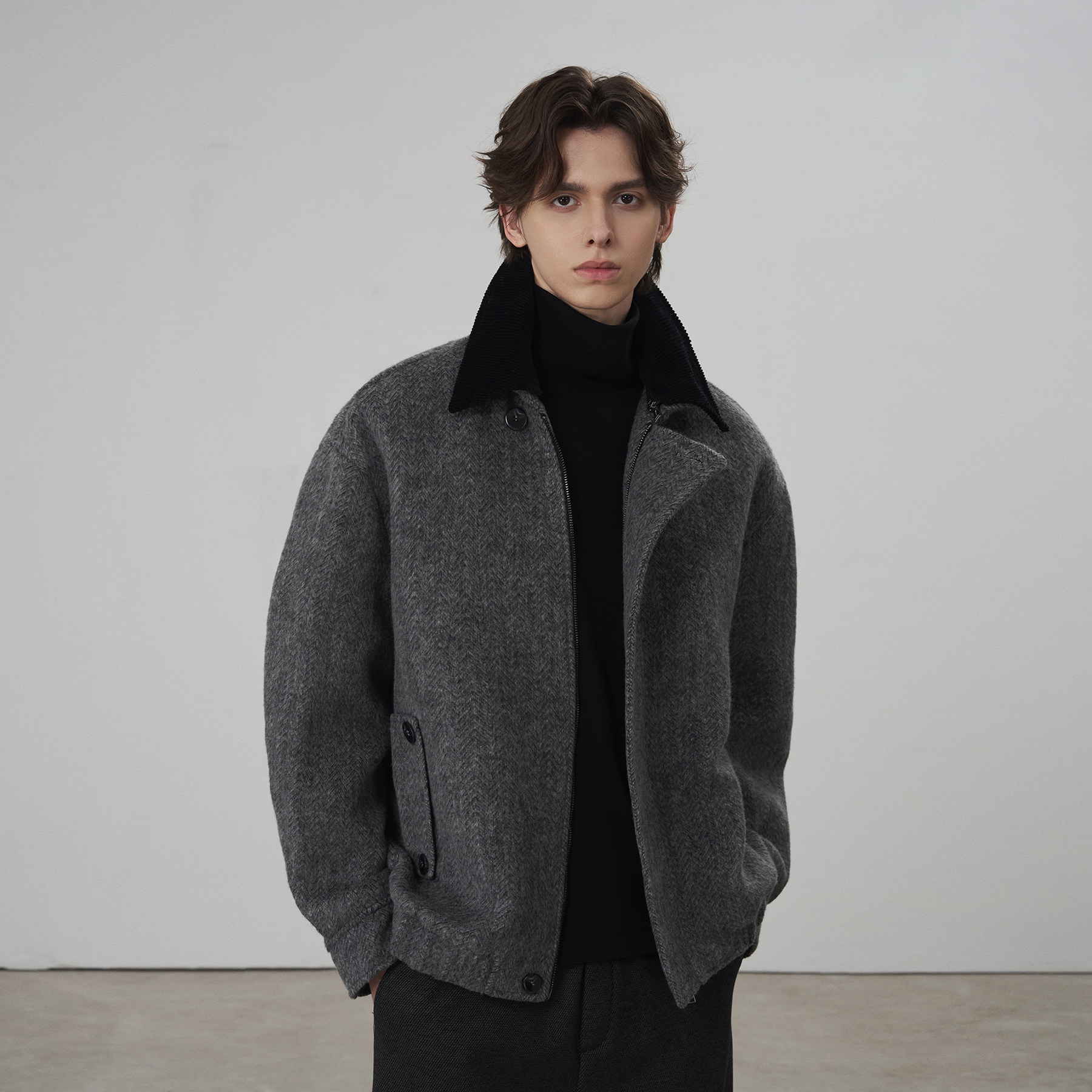 Our2 羊毛复古设计师水洗立领夹棉毛呢大衣 圣诞杂色大衣