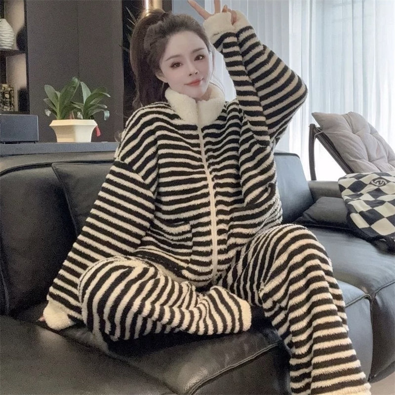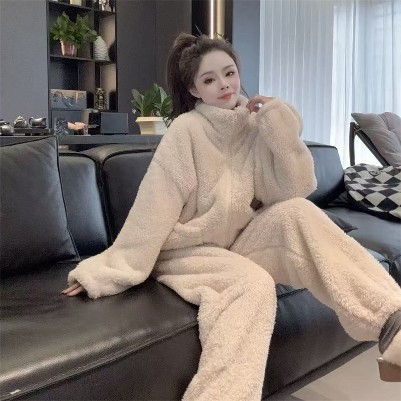 慵懒风毛毛双面珊瑚绒加厚保暖立领拉链睡衣女秋冬新款 居家服套装