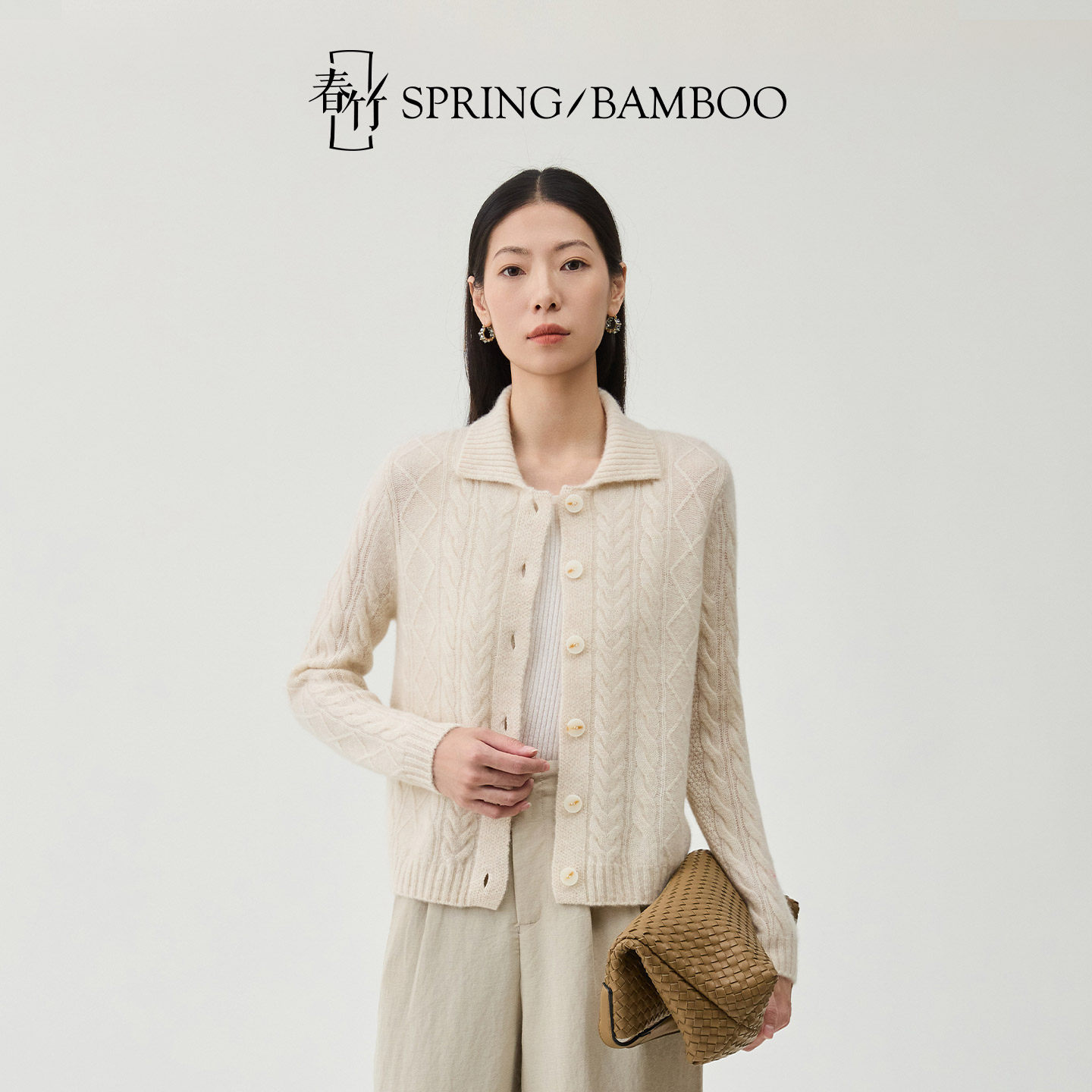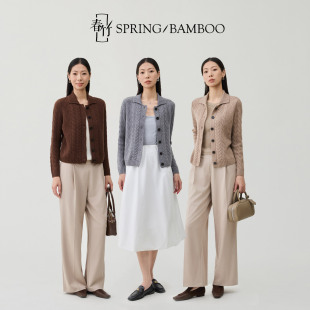 女士羊绒开衫 春竹100%山羊绒翻领绞花秋冬新款 长袖