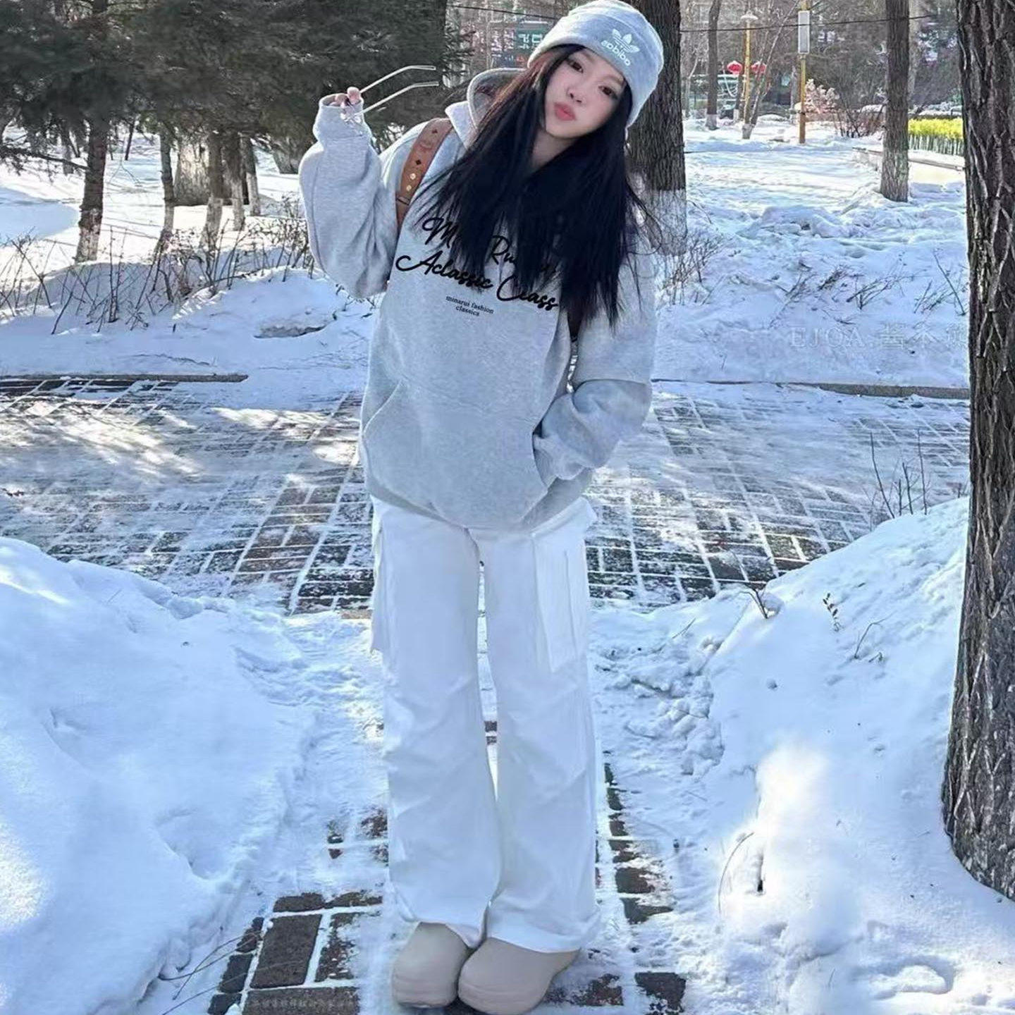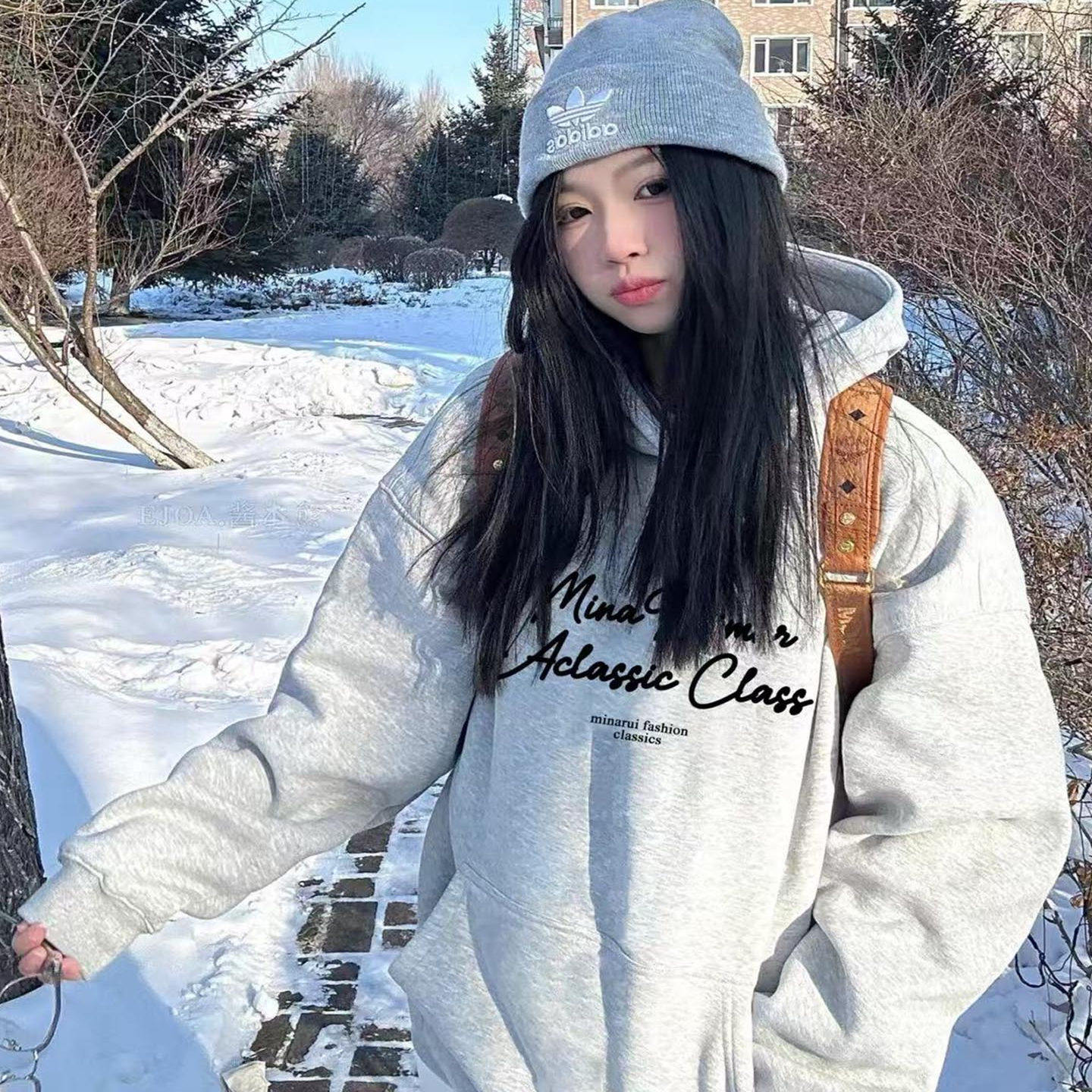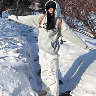 秋冬加绒加厚花灰色连帽卫衣女韩系宽松慵懒设计感小众情侣装 外套