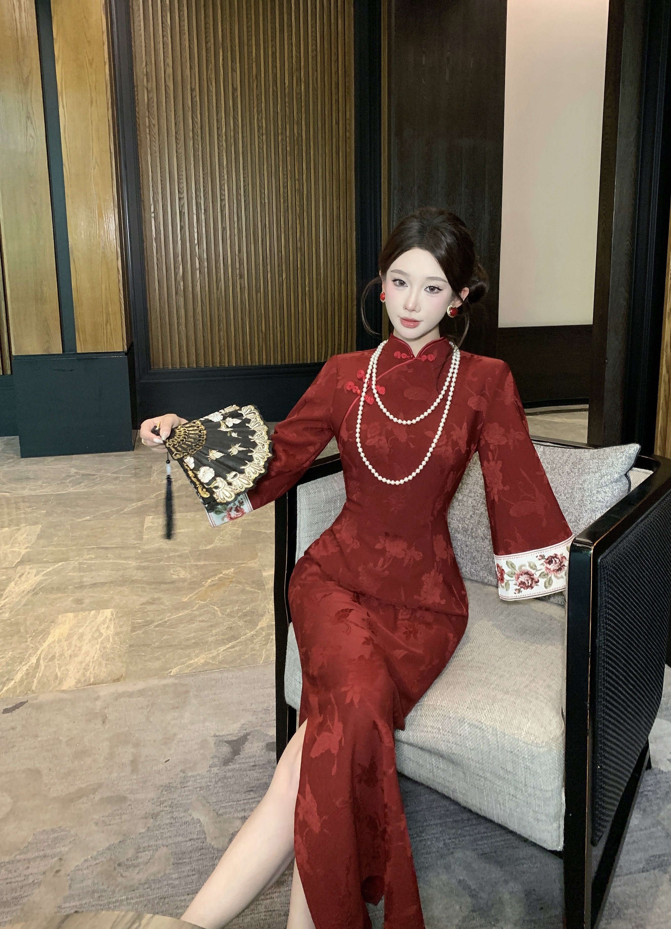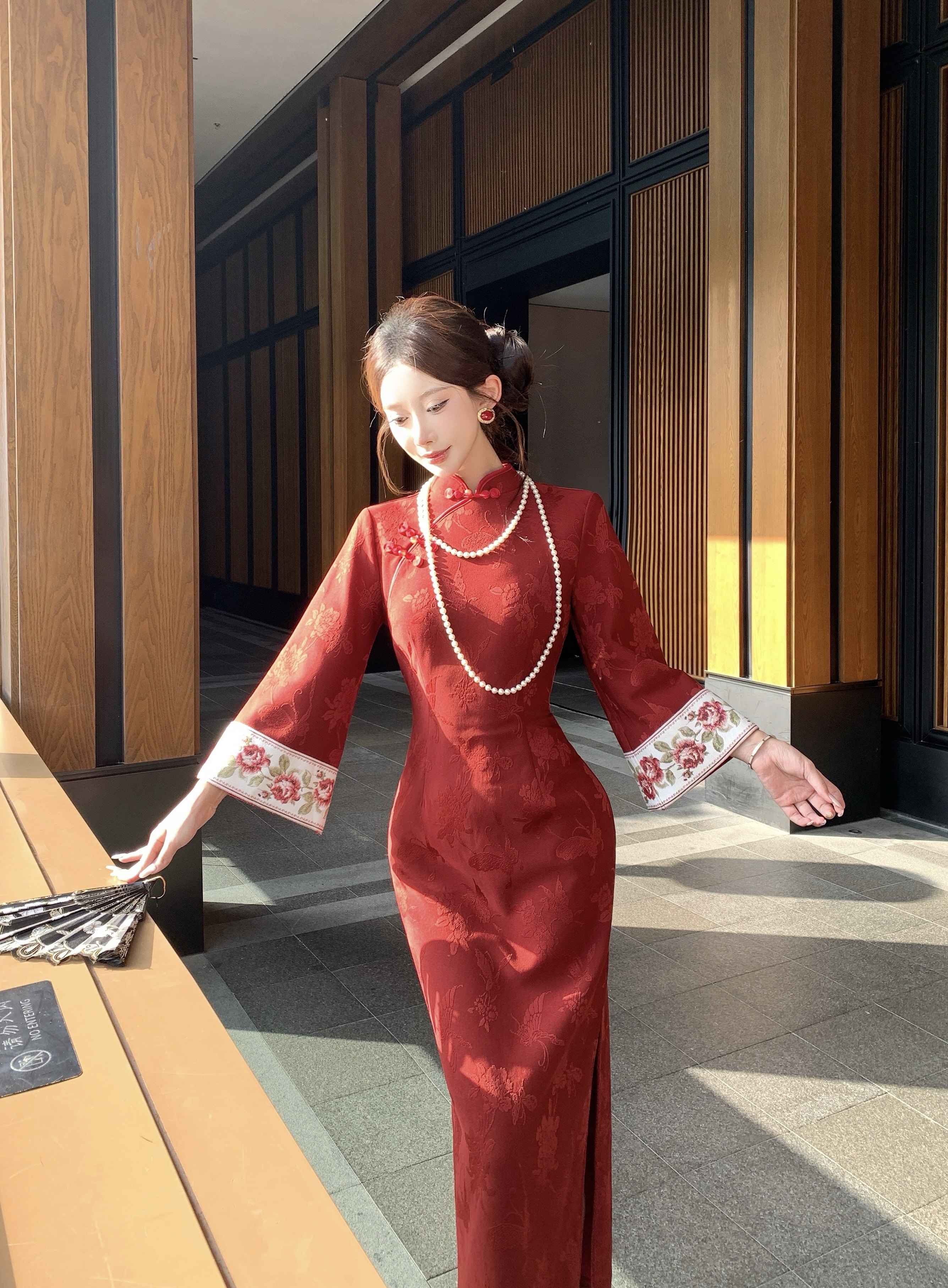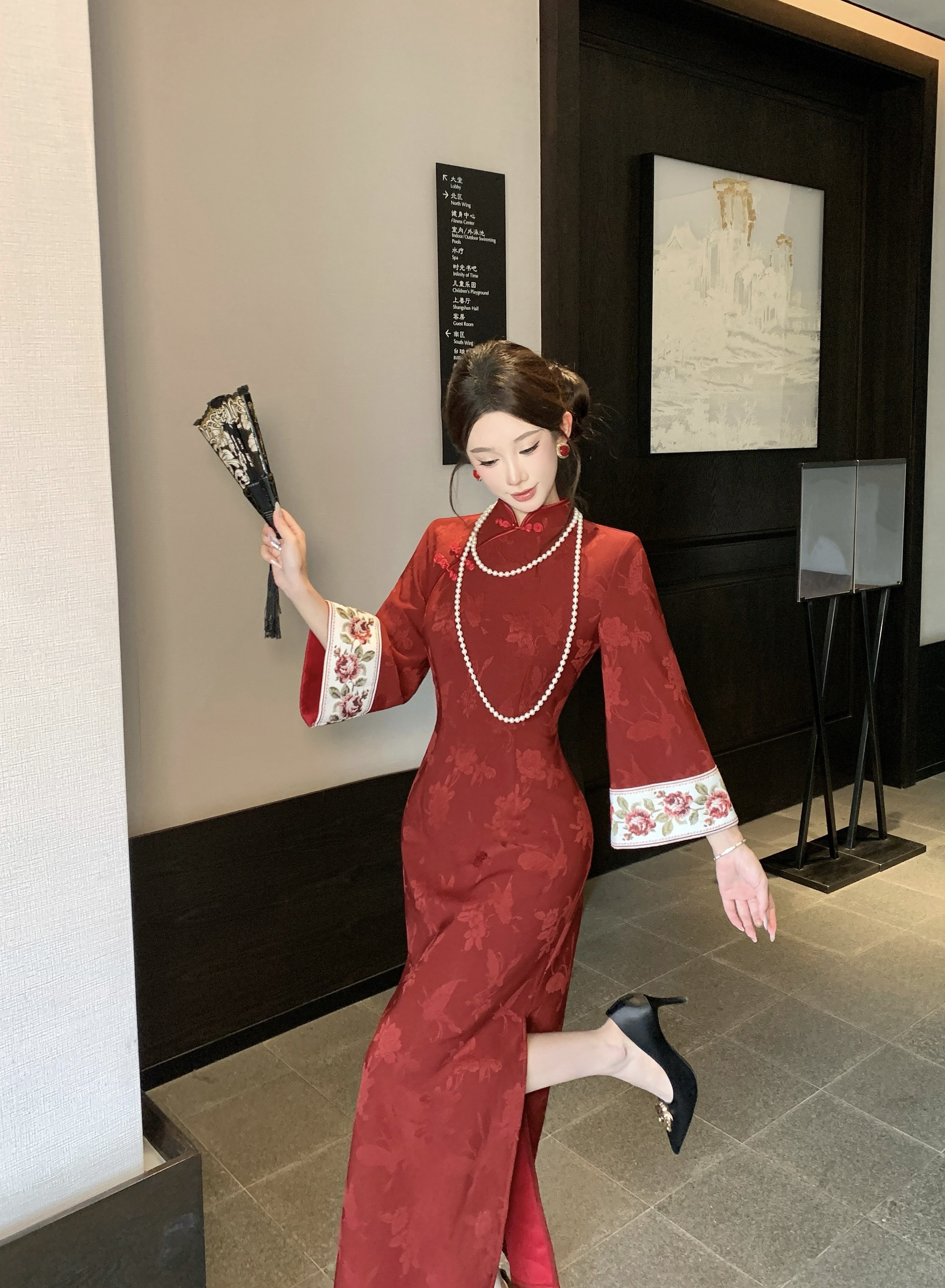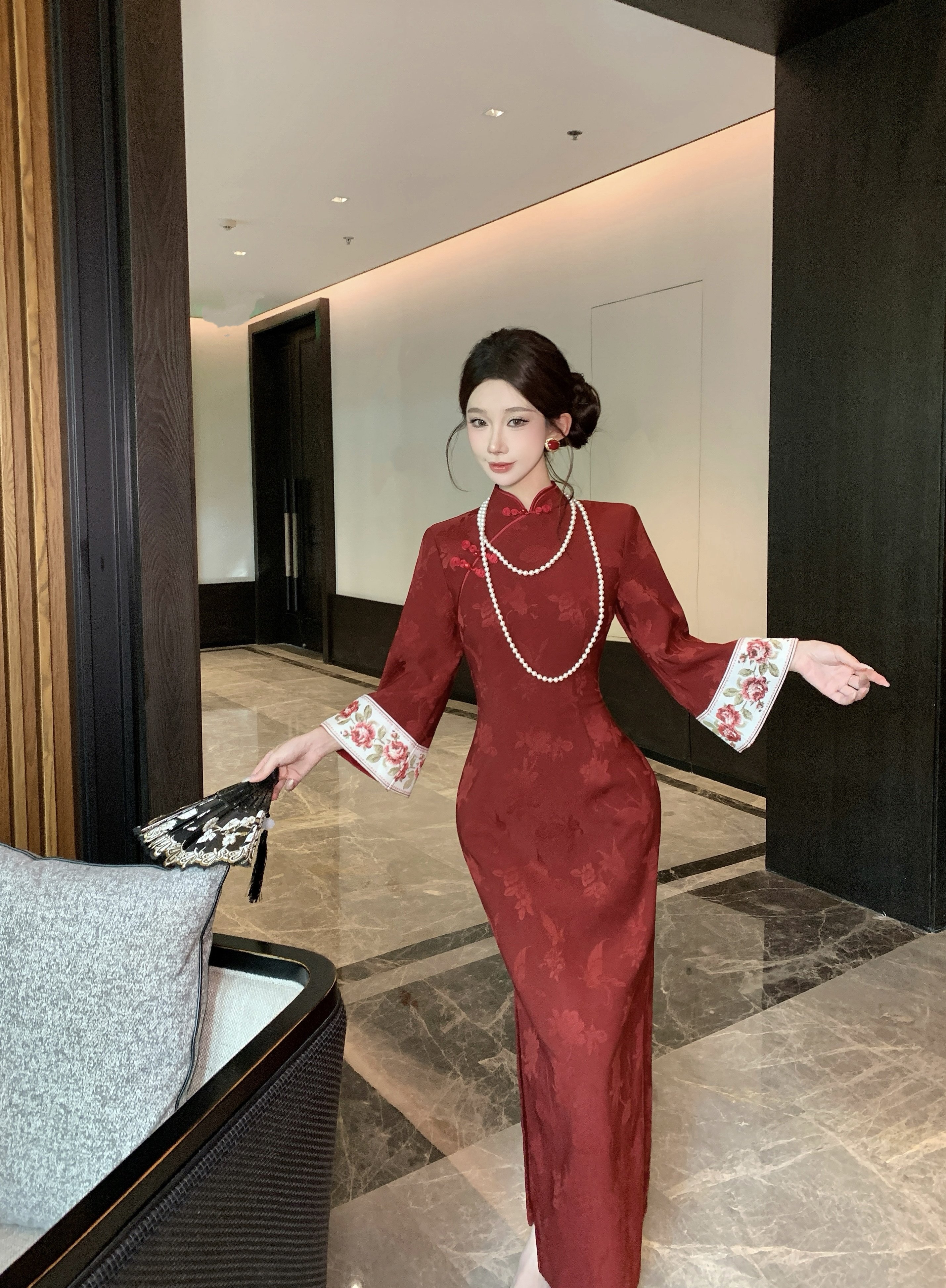 敬酒服红墙蝴蝶倒大袖 新中式 酒红色玫瑰订婚刺绣旗袍秋冬礼服长袖