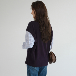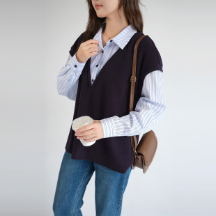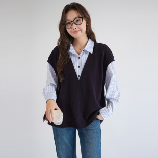 2026春新款 蓝若水大码 马甲假两件 减龄叠穿条纹上衣 层次感衬衫