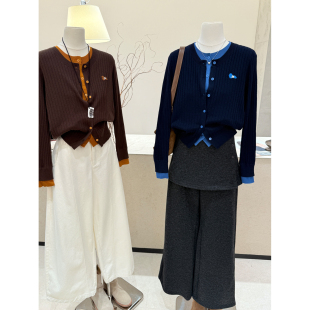 高级感独特外搭上衣外套 女秋冬新款 韩版 圆领假两件坑条针织开衫