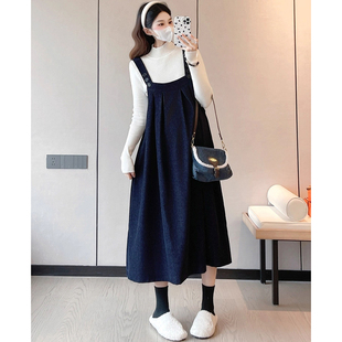 藏蓝色遮肚背带裙打底衫 韩版 两件套 春秋冬2025新款 孕妇连衣裙套装