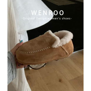 小众保暖毛毛棉鞋 牛皮版 棕色手工缝线套筒加绒厚底雪地靴女冬季