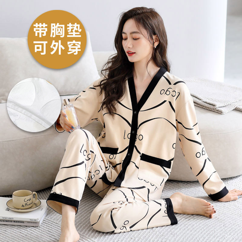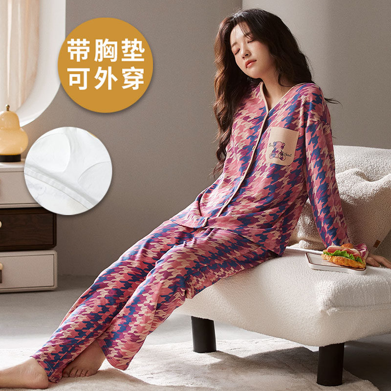 韩式 浪莎带胸垫睡衣女春秋季 长裤 长袖 家居服可外穿两件套 纯棉薄款