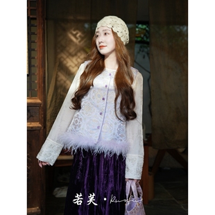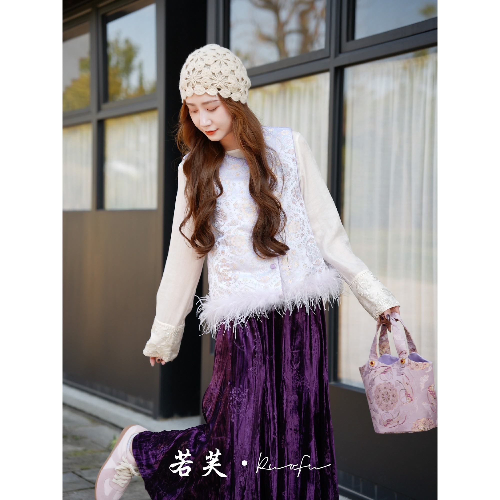 桑蚕宋锦夹棉马夹鸵鸟毛拼接设计 新中式 若芙| 紫色宝相花