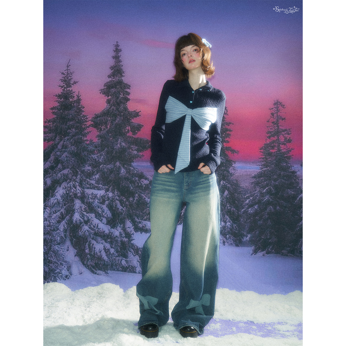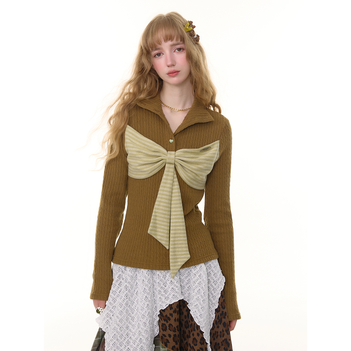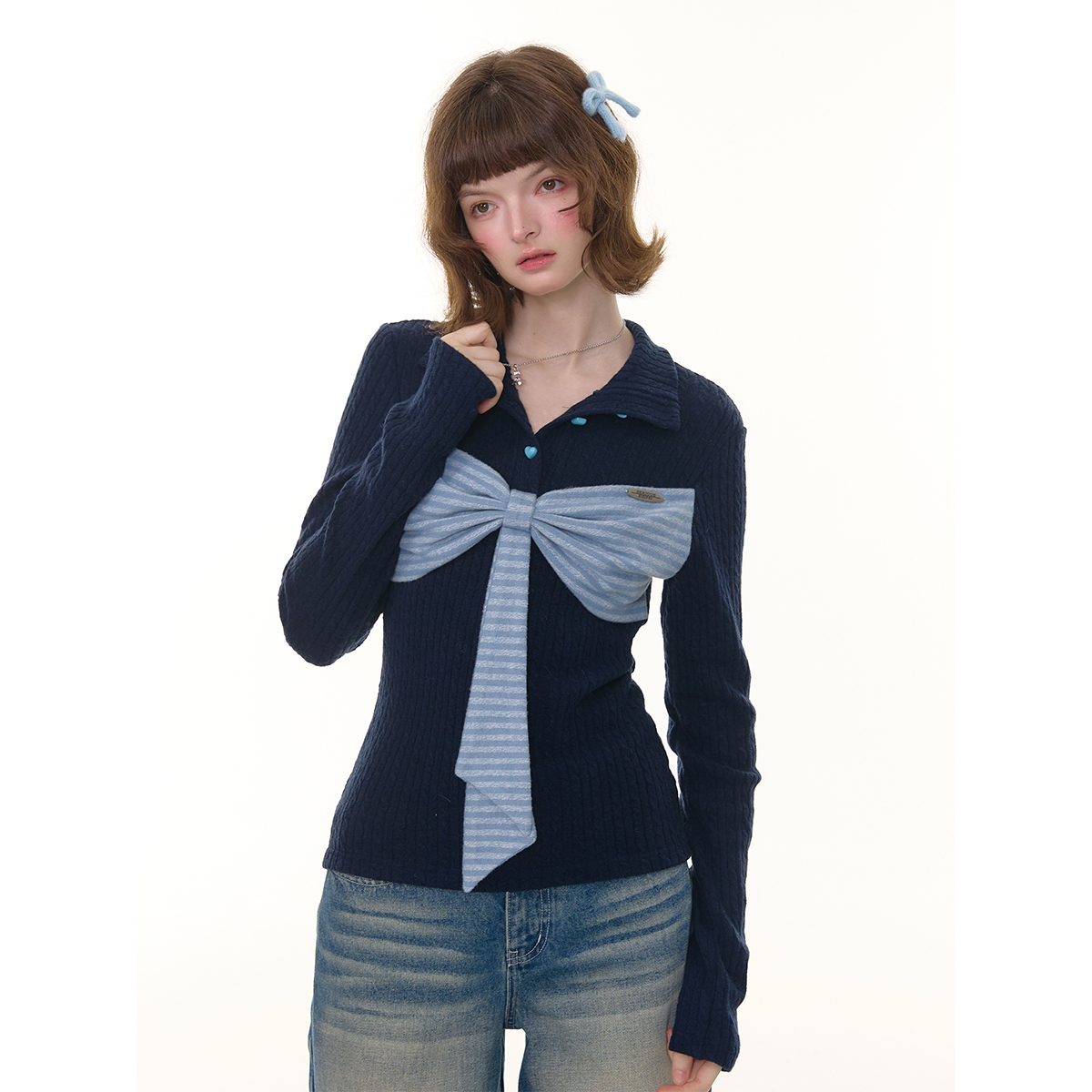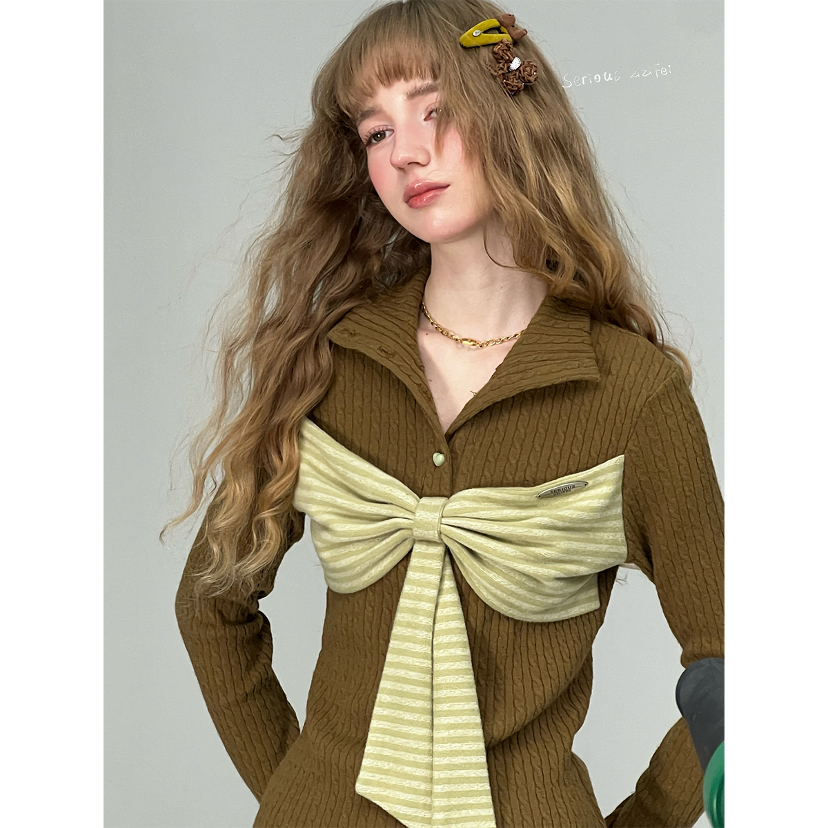 女 t恤针织衫 ziziFei秋冬美式 设计感撞色拼接蝴蝶结半高领上衣长袖
