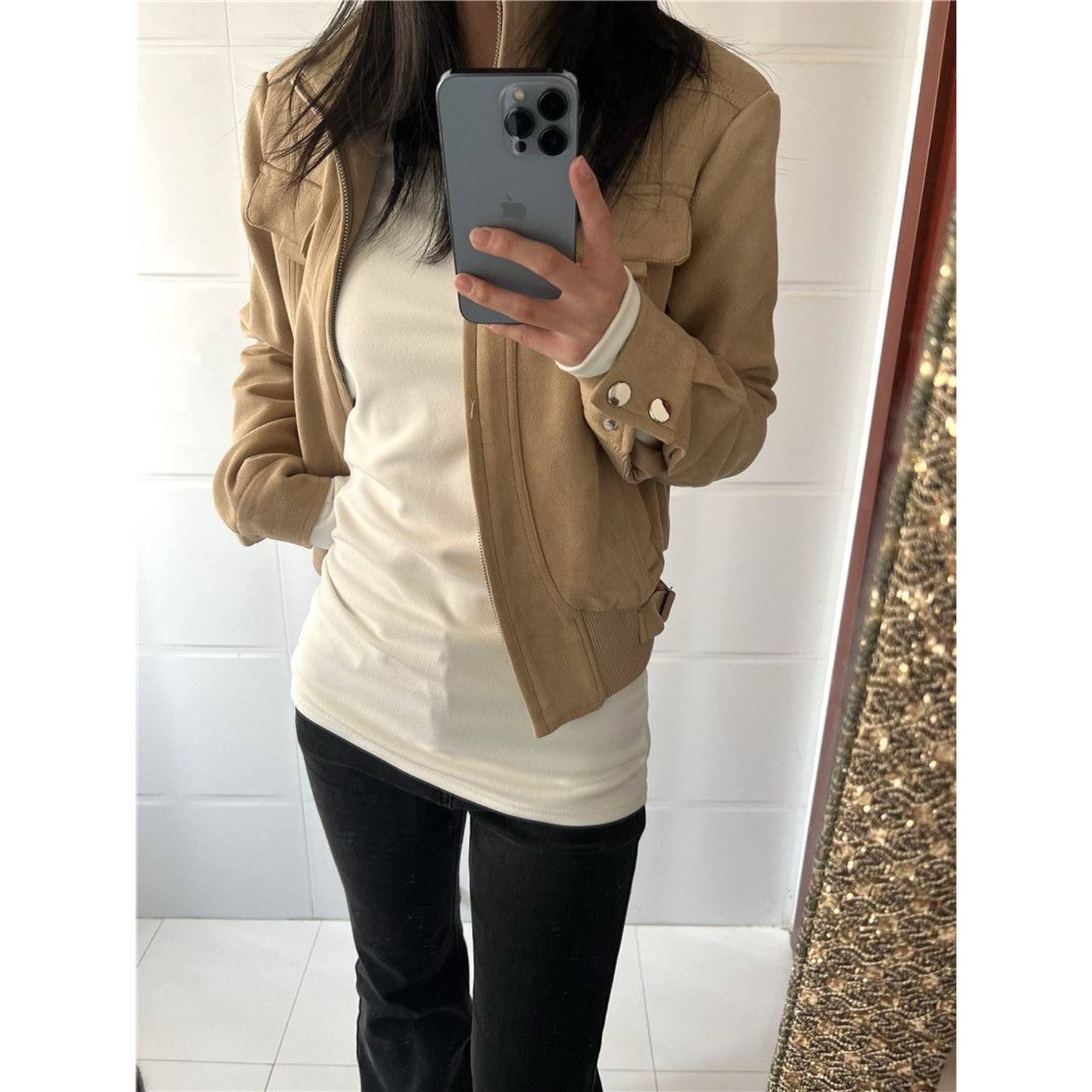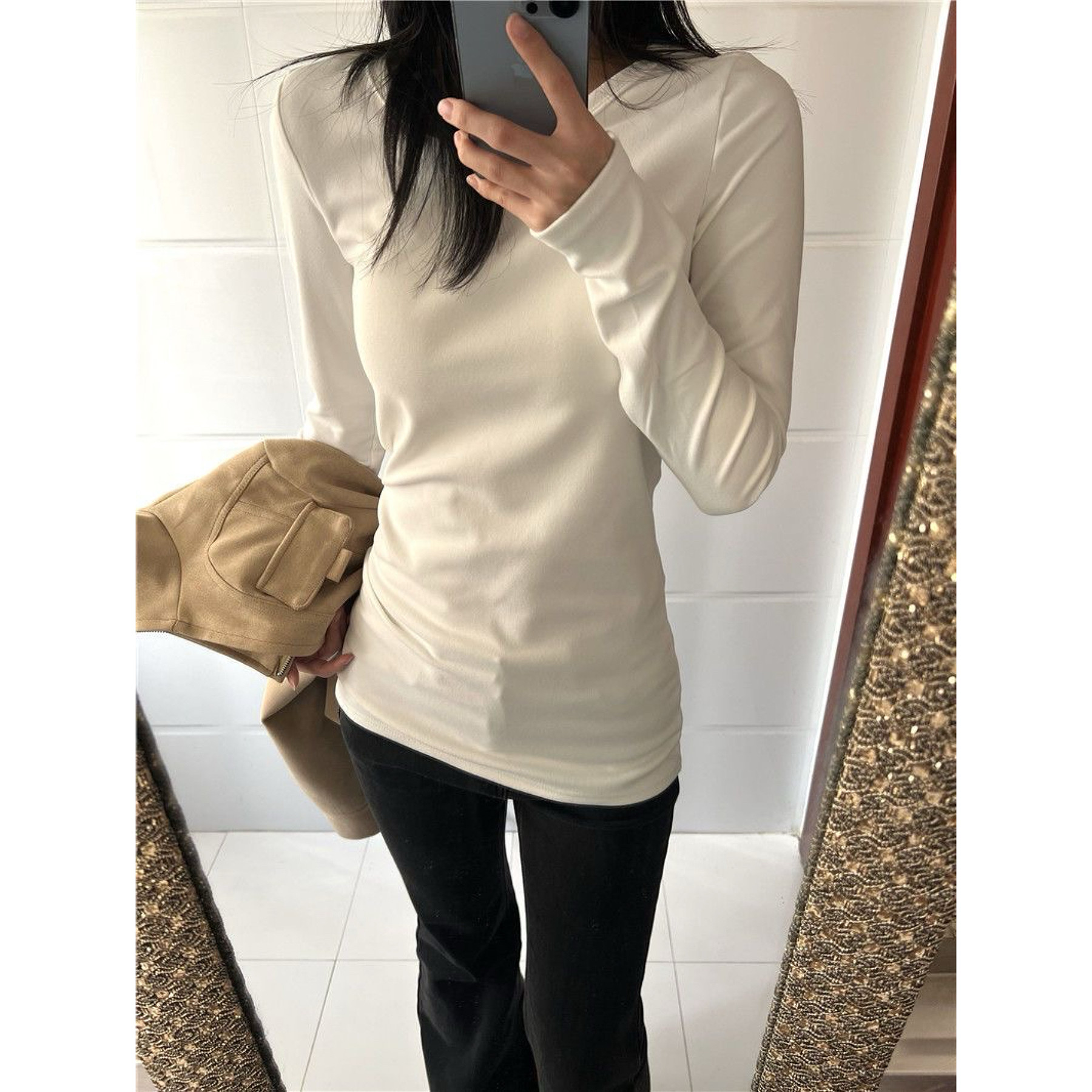 显瘦打底衫 t恤女春秋冬韩系百搭圆领修身 长袖 德绒白色正肩中长款