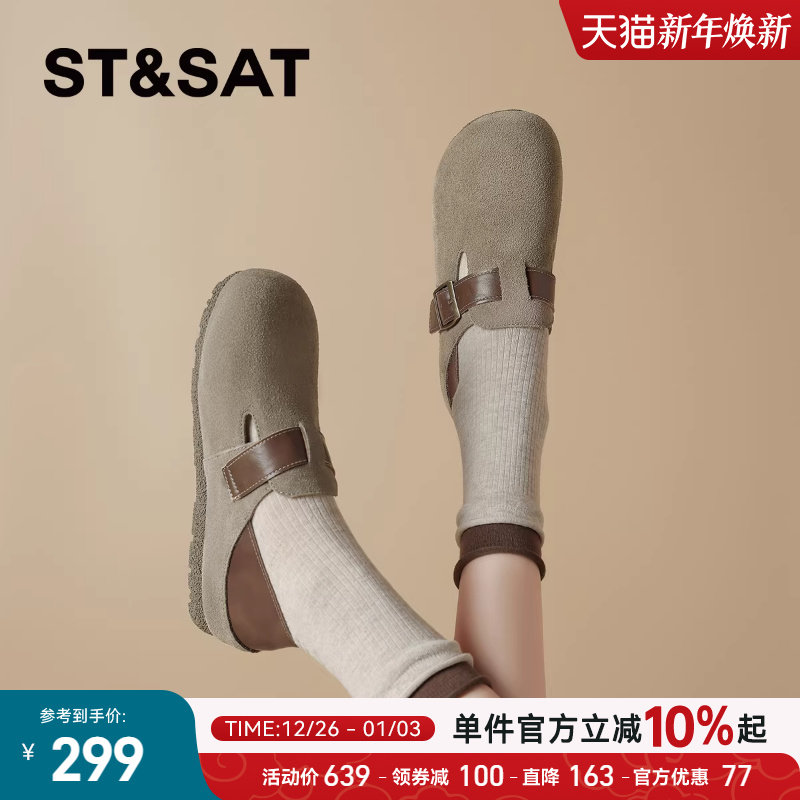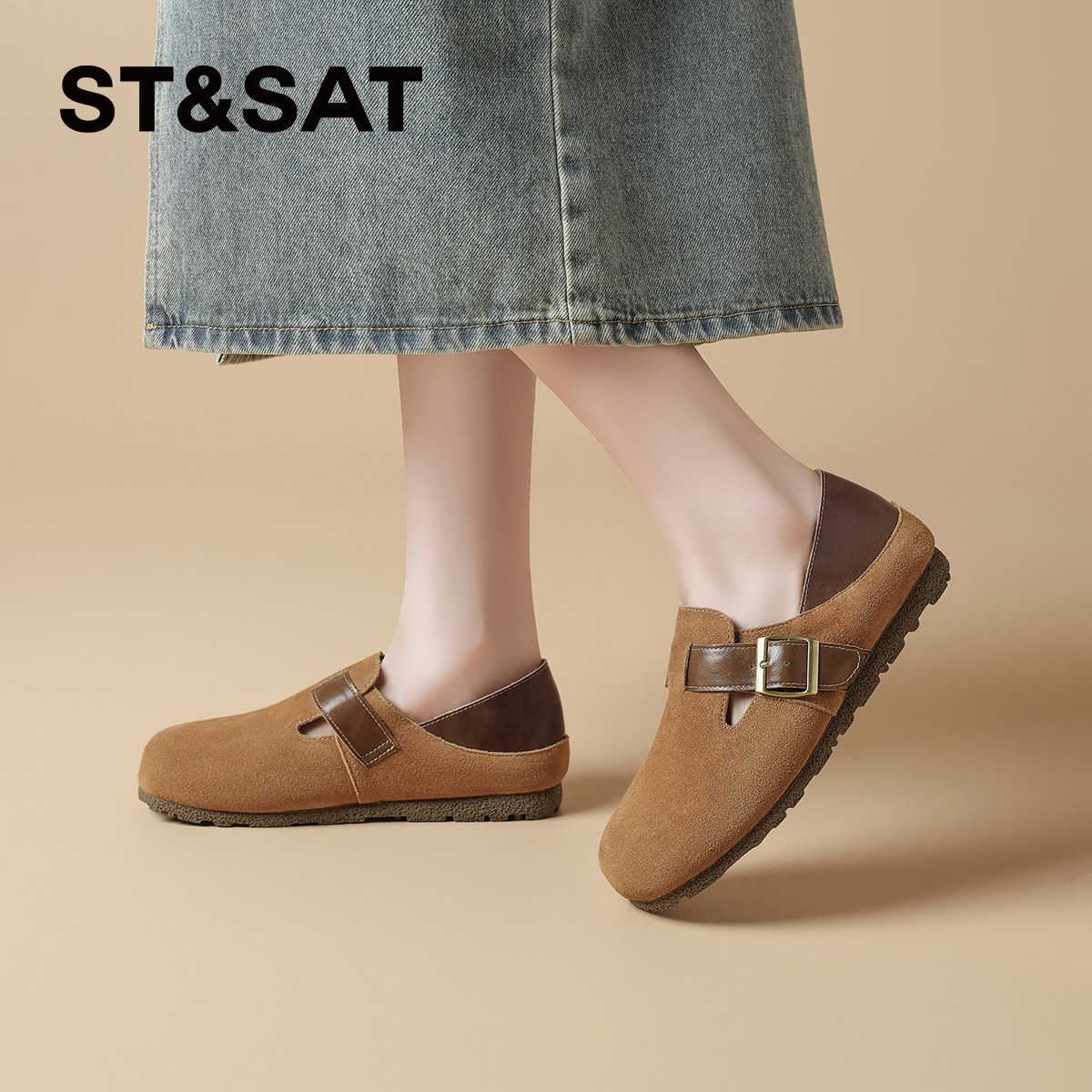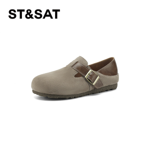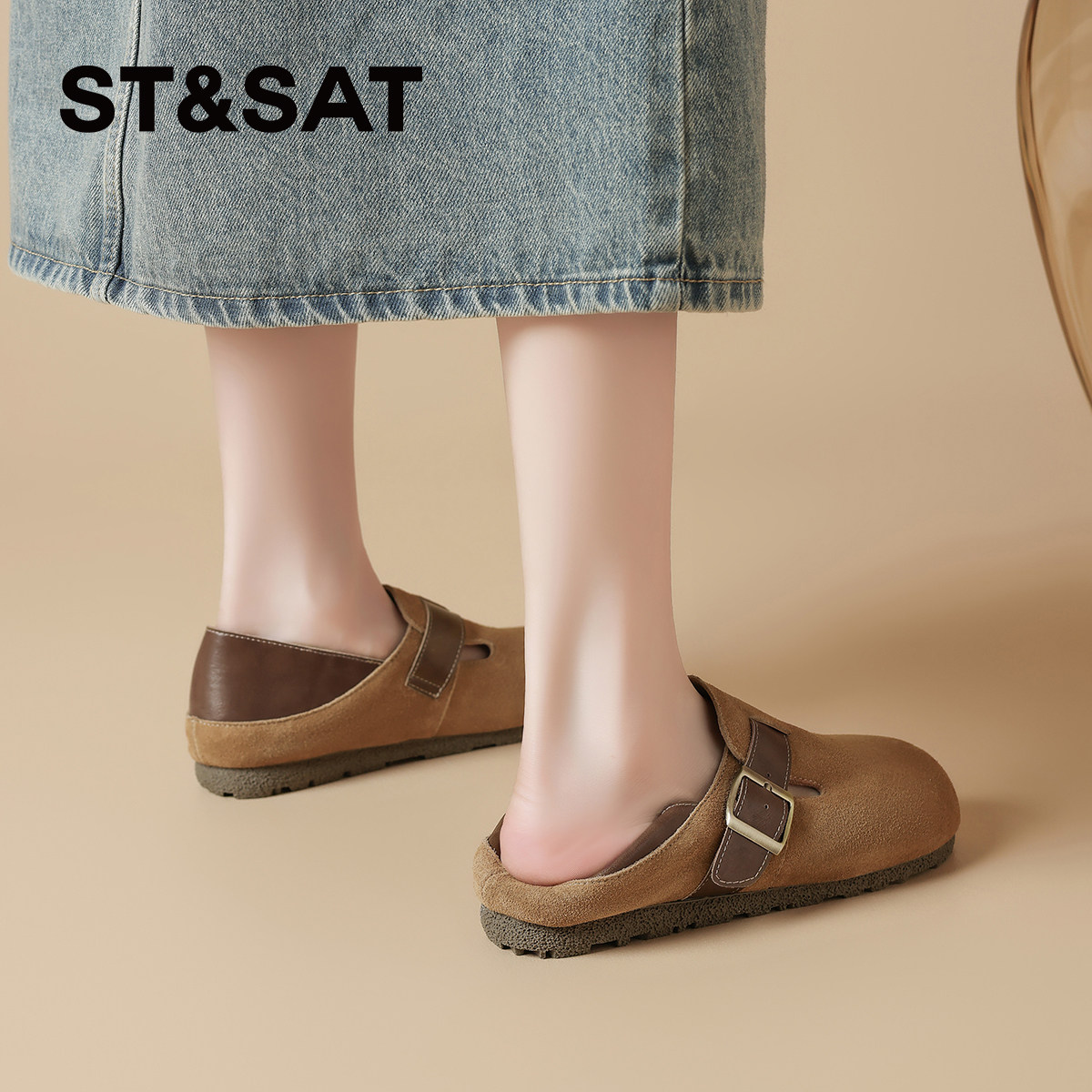 直 星期六复古两穿真皮勃肯鞋 拼色懒人博肯单鞋 新款 女2025秋季