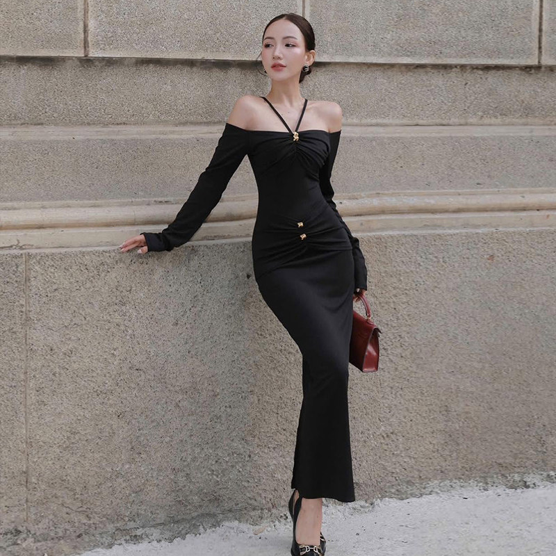 VanessaLab欧美一字领黑色露肩连衣裙女礼服长袖 收腰显瘦拖地长裙