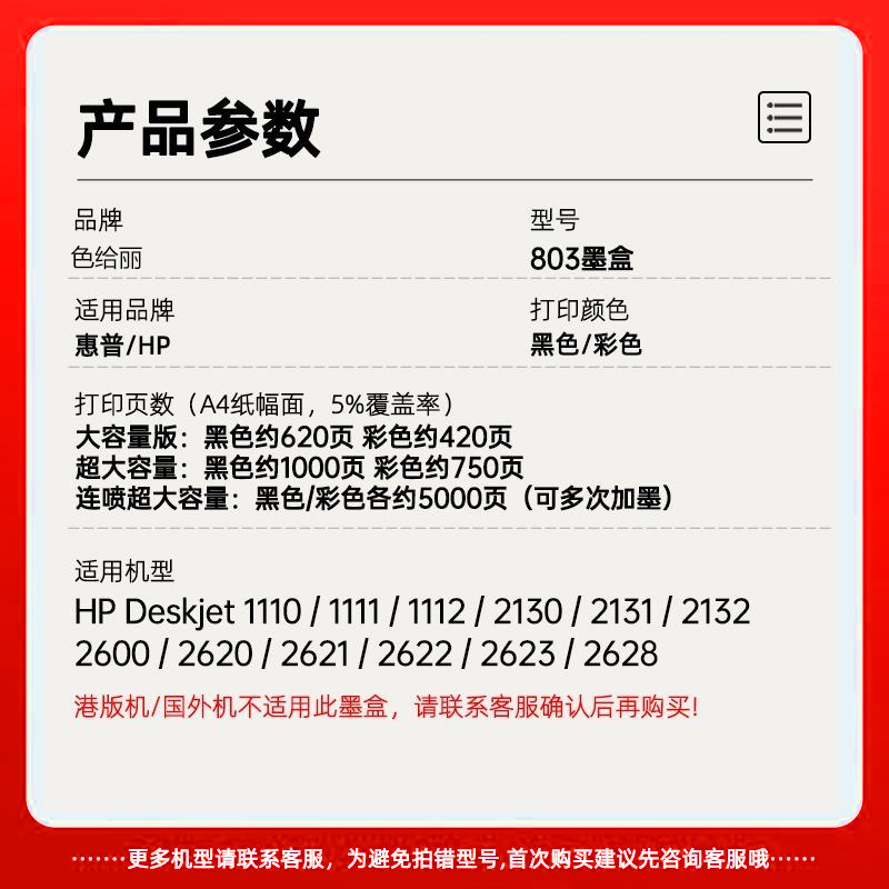 2623 2628可加墨2600 2130 适用惠普803墨盒HP2132 1111 2622 2131黑彩色1110 1112打印机XL连喷DeskJet 2621