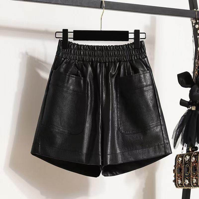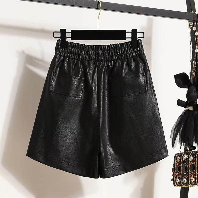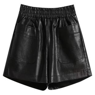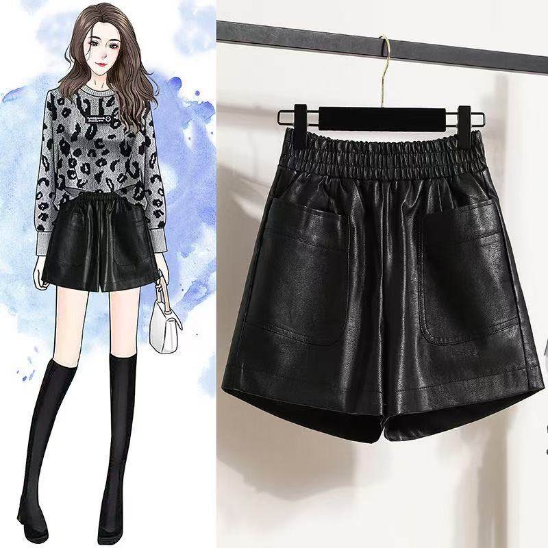 大码 休闲裤 黑色a字阔腿裤 女显瘦百搭松紧PU皮裤 女 皮短裤 秋冬新款