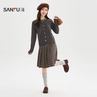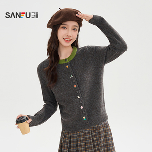 撞色圆领外套休闲慵懒风上衣女装 冬季 511808 2025新款 三福毛衣开衫