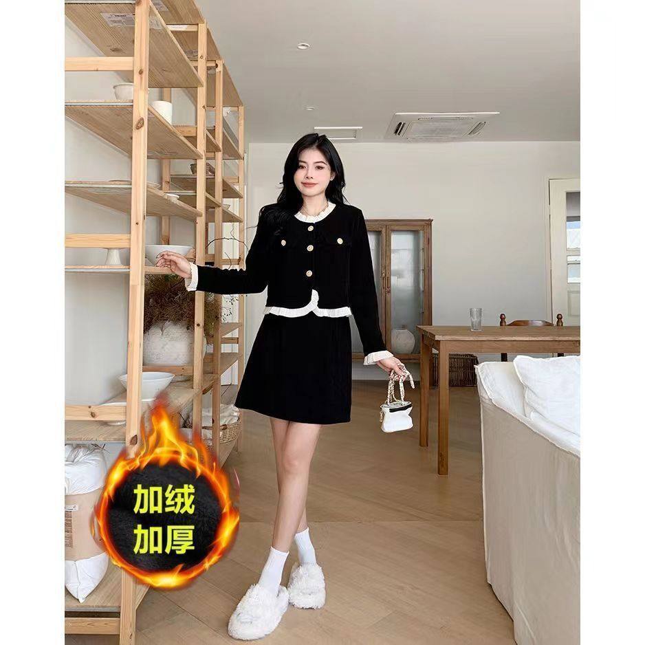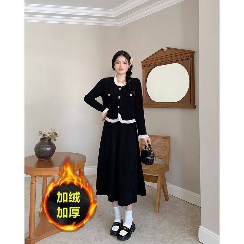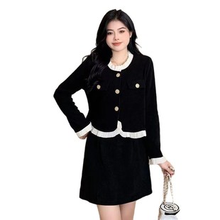 大码 裙两件套木耳边秋冬显瘦遮肉灯芯绒加绒加厚 套裙小香风套装