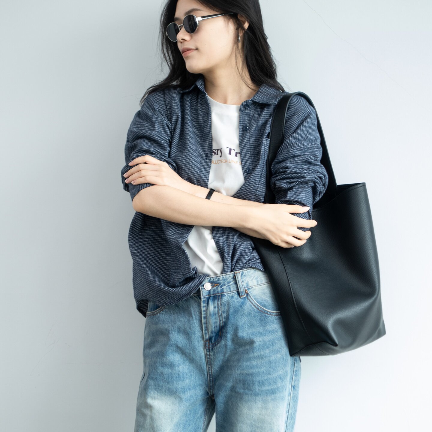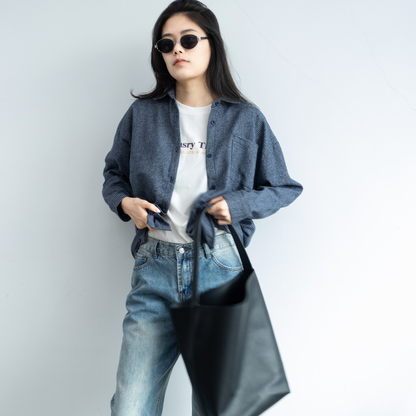 2025年春秋新款 外套上衣女潮 简约磨毛宽松显瘦深蓝小格子休闲衬衫