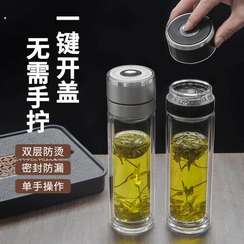 保温杯一键按压开盖玻璃杯双层速开茶水分离泡茶茶杯男士 车载水杯