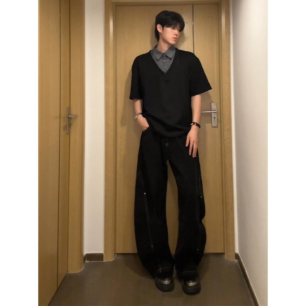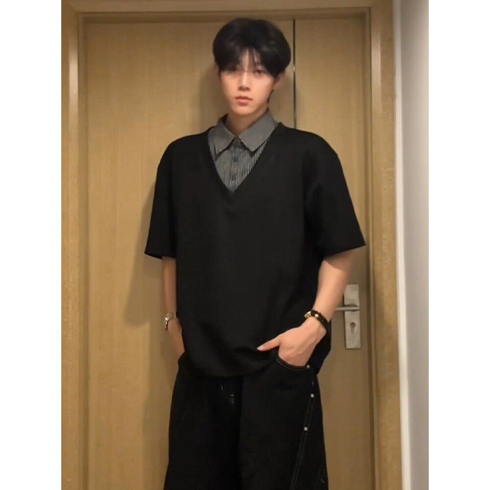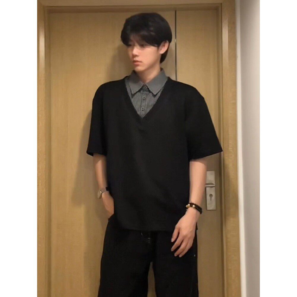 T恤宽松百搭POLO衫 大码 领垂感短袖 男假两件V领拼接衬衫 300斤美式