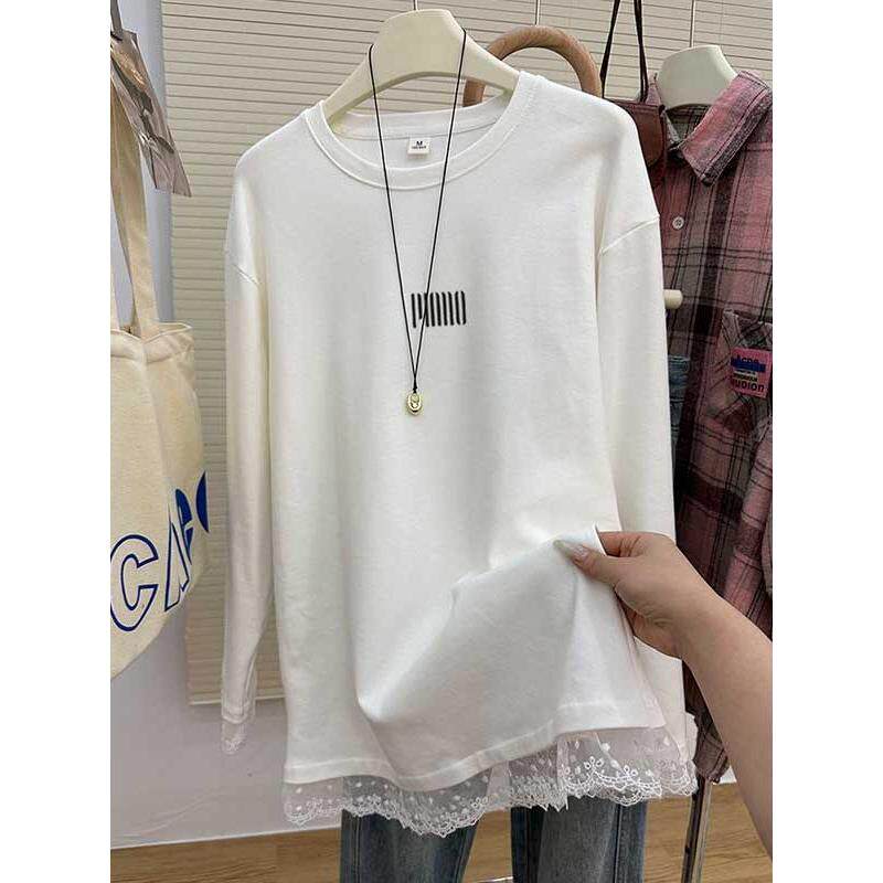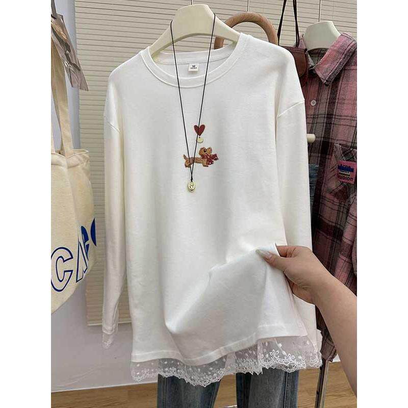 t恤女春秋百搭上衣 蕾丝磨毛纯棉圆领长袖 韩国Honey koko⭐中长款