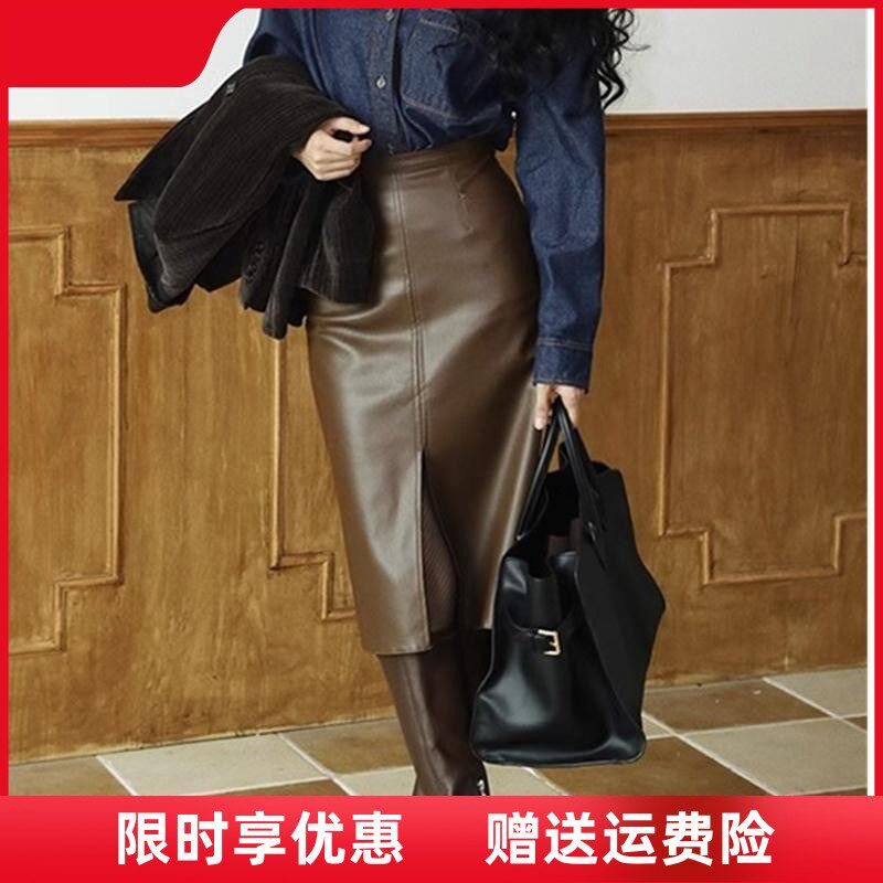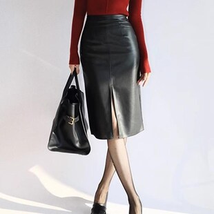 港风复古高腰前开叉皮裙大码 一步裙 半身裙女秋冬直筒包臀裙中长款