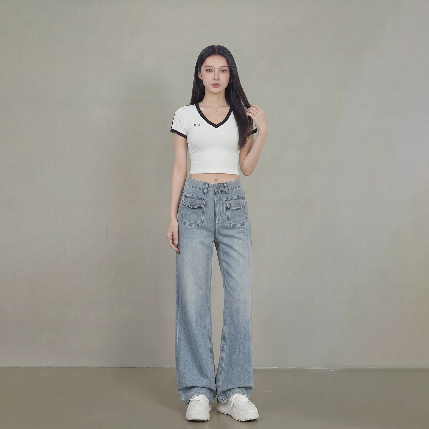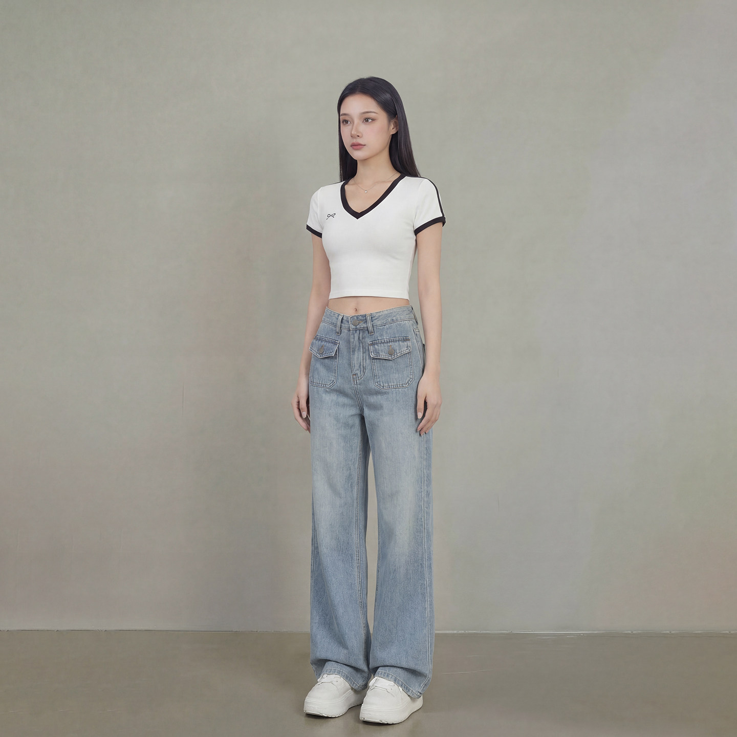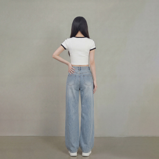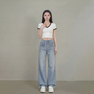 子 辣妹直筒长裤 艾格2026春夏做旧阔腿牛仔裤 女高腰翻盖垂感拖地裤