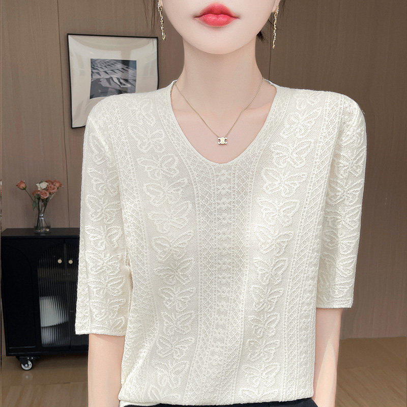 五分袖 法式 女2026新款 打底衫 T恤遮肉上衣薄 高级感浮雕提花V领半袖