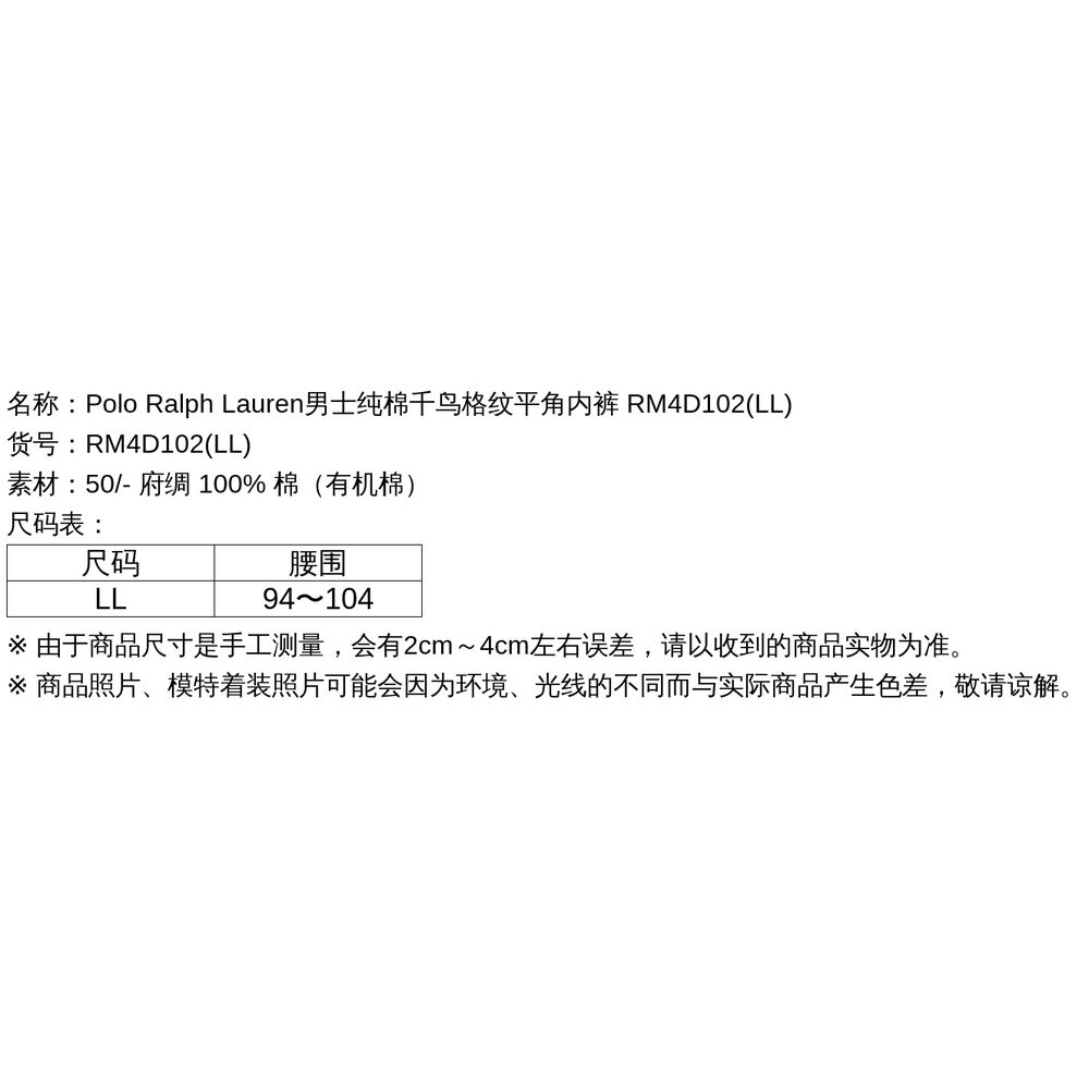 纯棉千鸟格纹平角内裤 1h可退 Lauren男士 Ralph RM4 日本直邮Polo