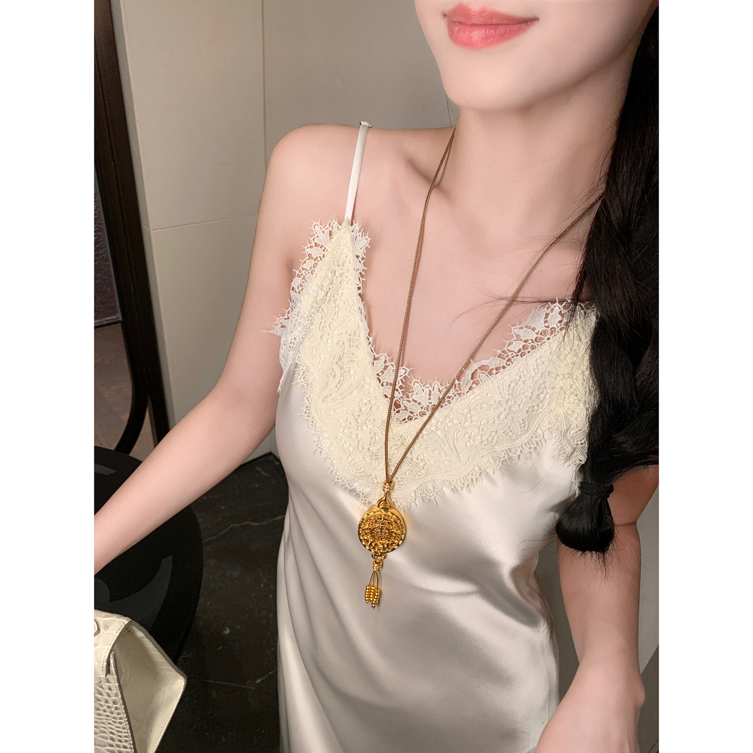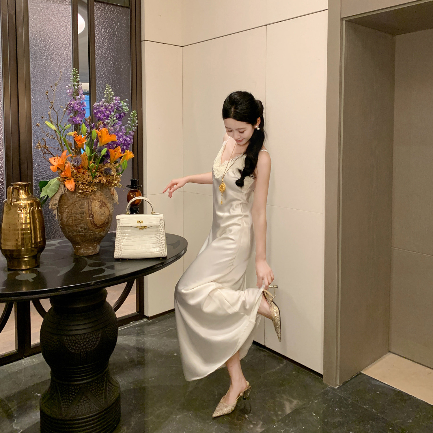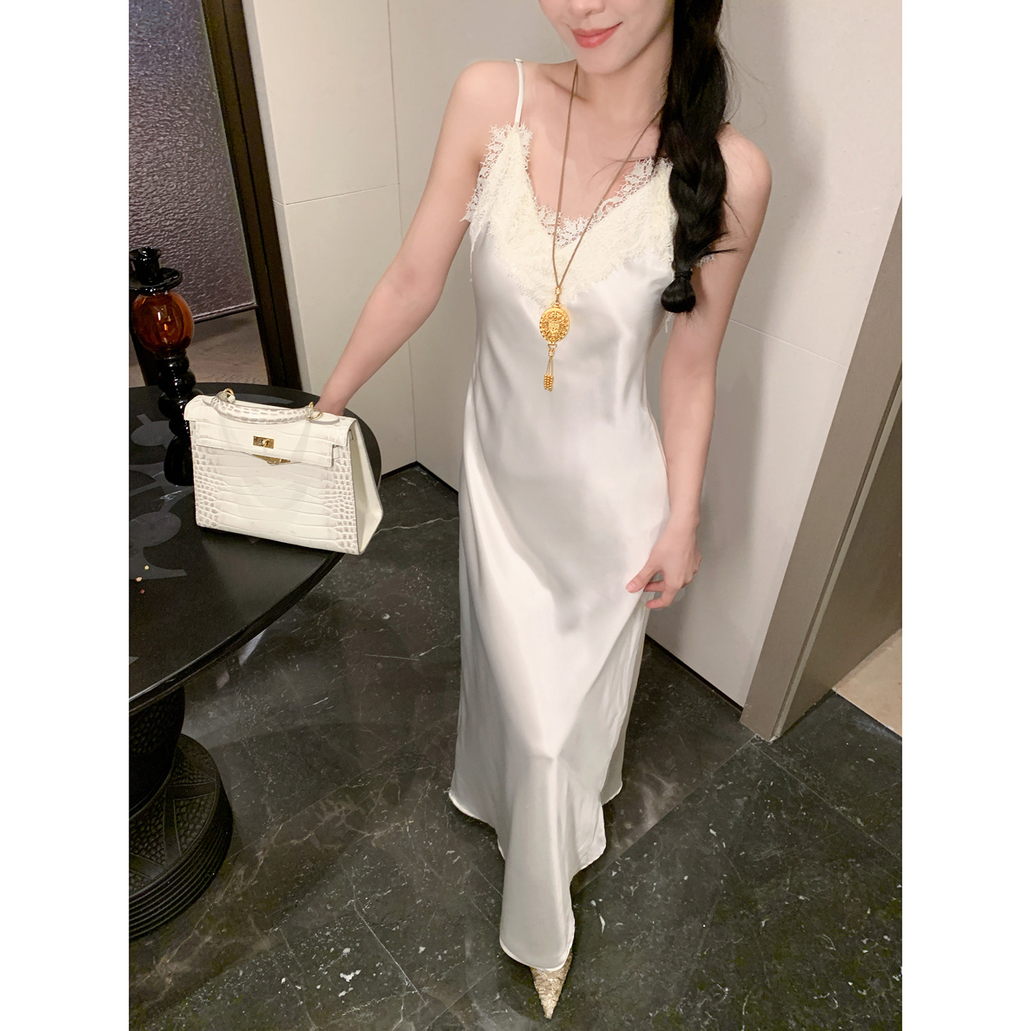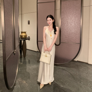 时尚 2026年新款 气质百搭缎面吊带裙 蕾丝拼接连衣裙女夏季 果果家