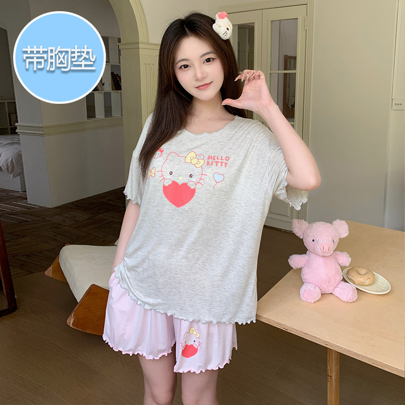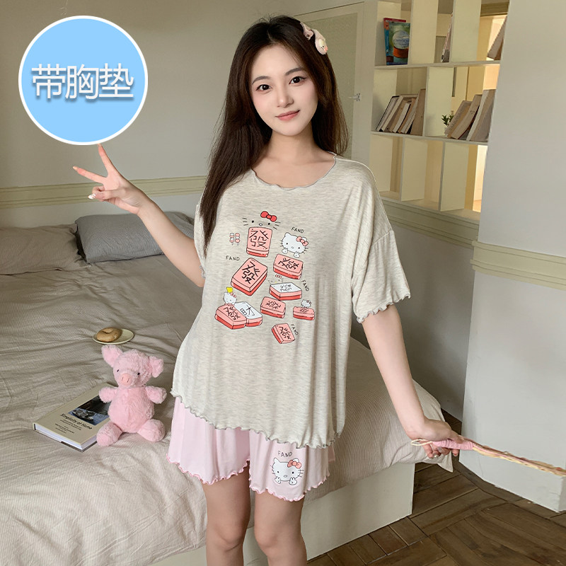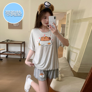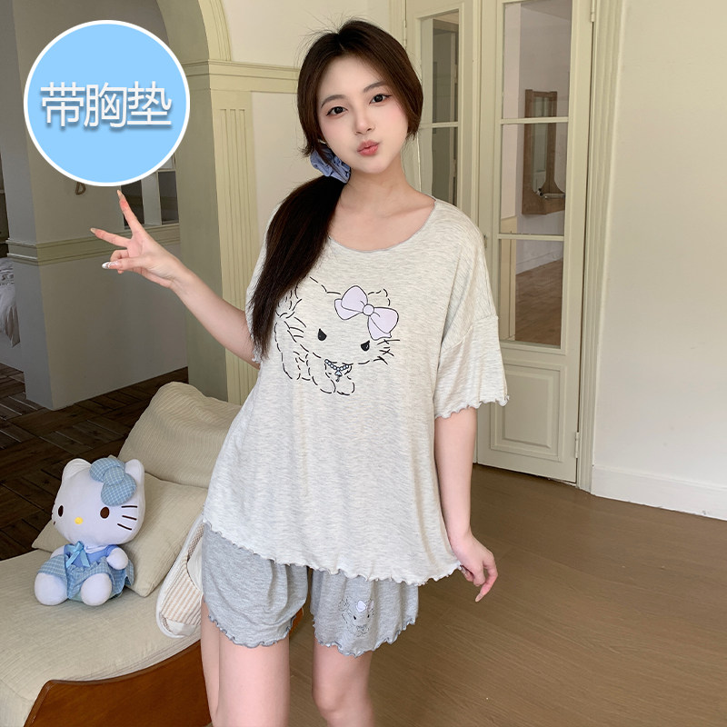 莫代尔凉感卡通可爱线条狗家居服两件套 短裤 带胸垫睡衣女夏款 短袖