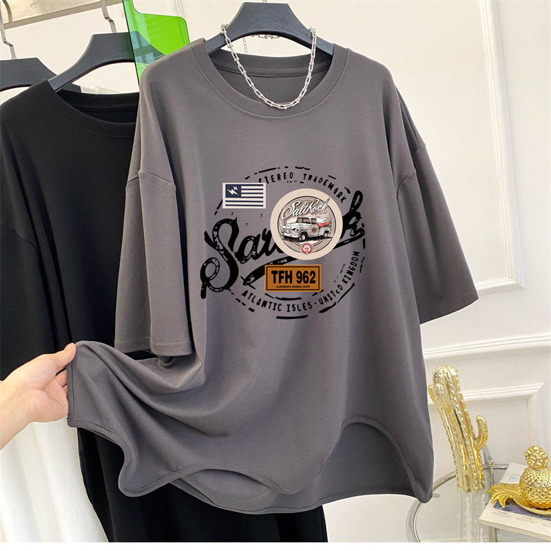 T恤女夏季 图案印花弧形下摆别致短袖 宽松上衣 200斤美式 胖妹妹大码