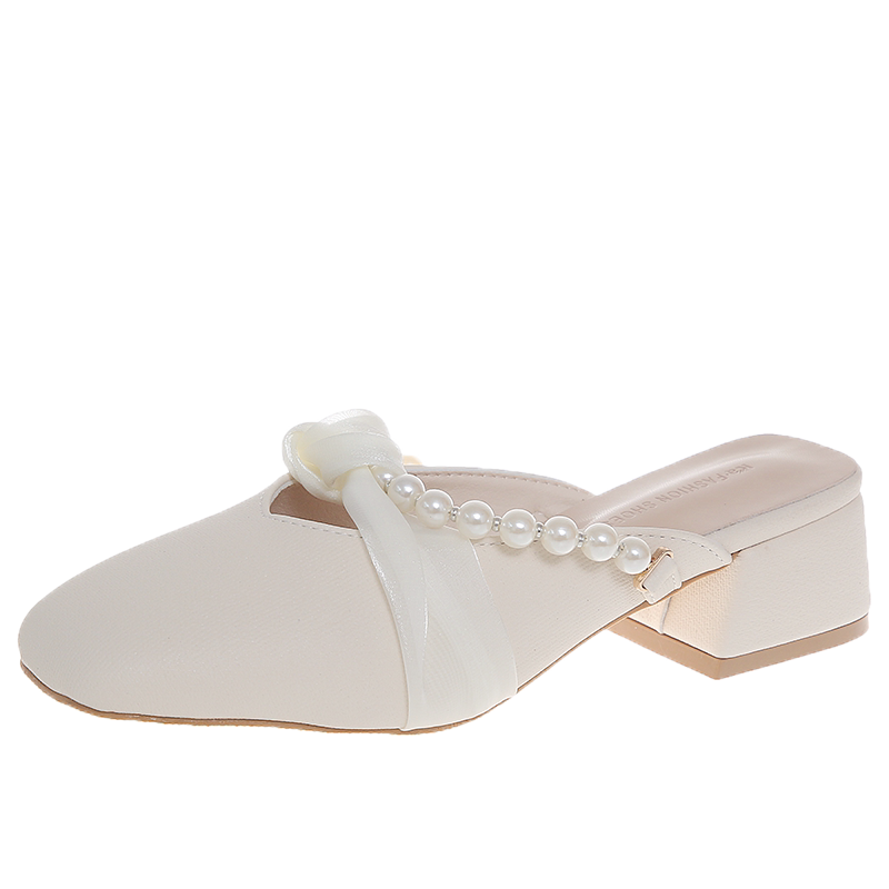 高跟鞋 女2026春夏新款 粗跟中跟懒人外穿 珍珠包头半拖鞋 仙女风法式