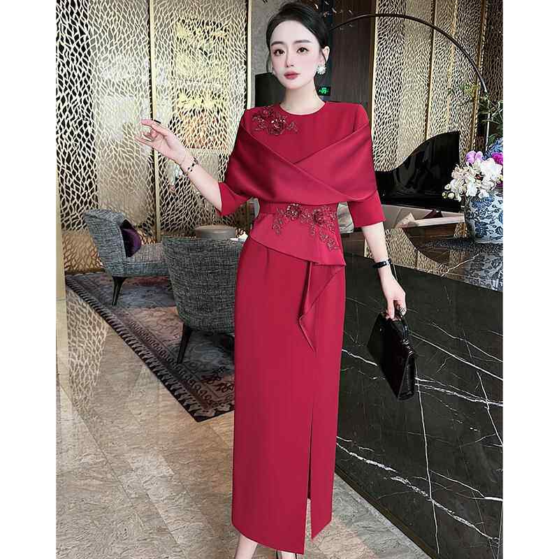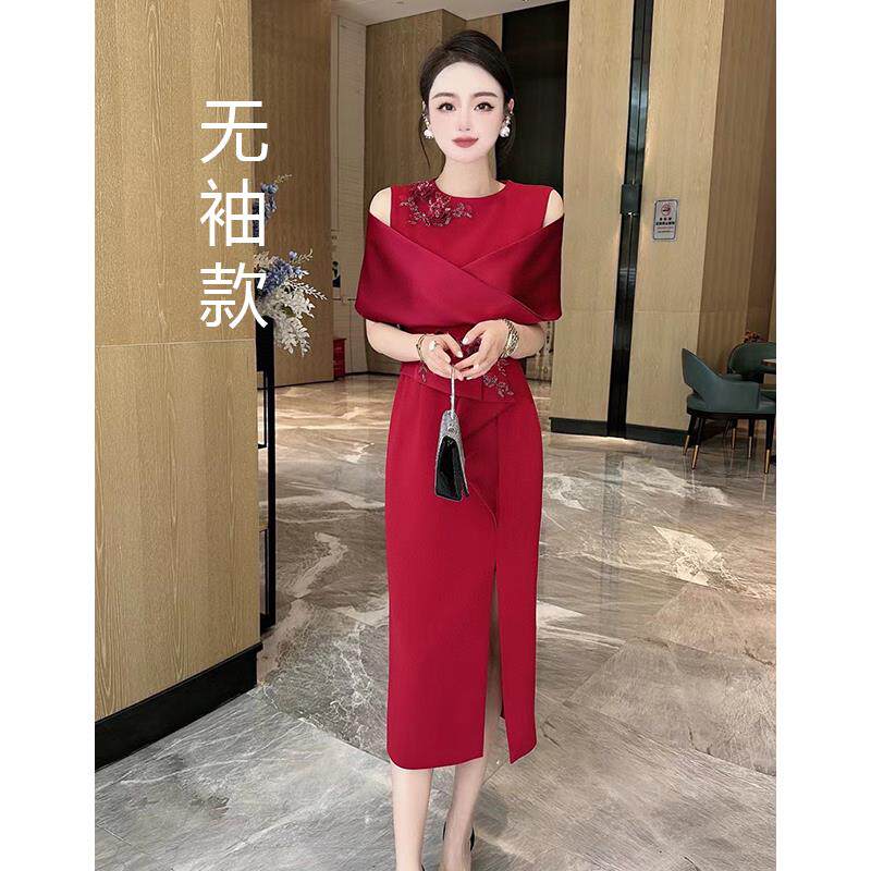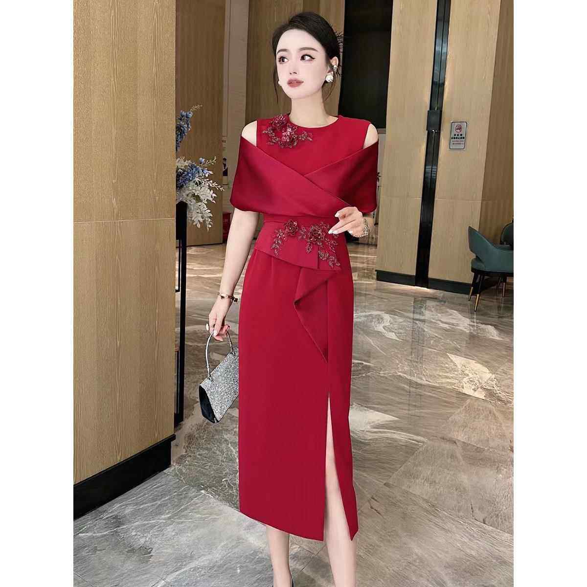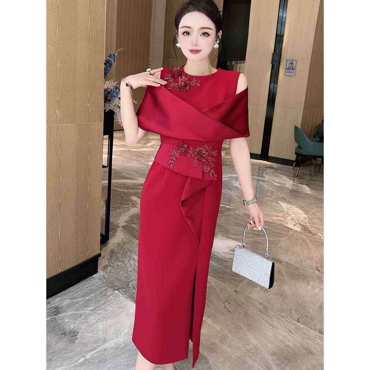 2024春夏重工绣花钉珠红色婚礼宴会红色礼服裙洋派时尚 显瘦洋装