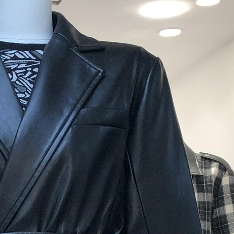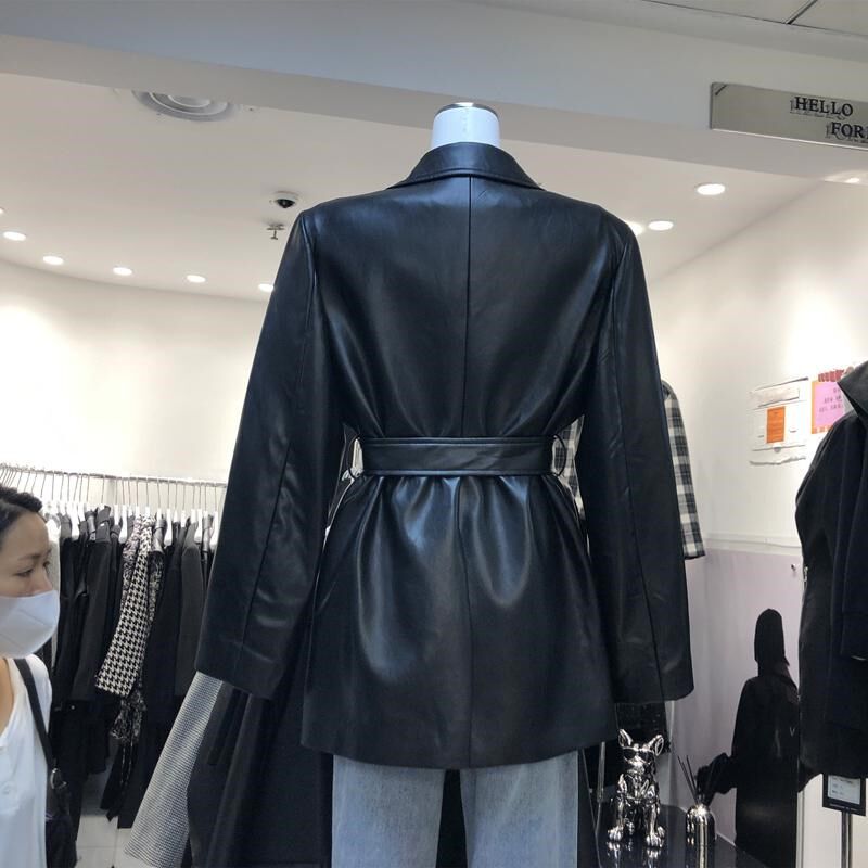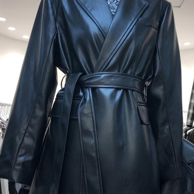 新款 韩版 外套女春季 系带西装 收腰显瘦宽松气质机车服皮衣女 中长款